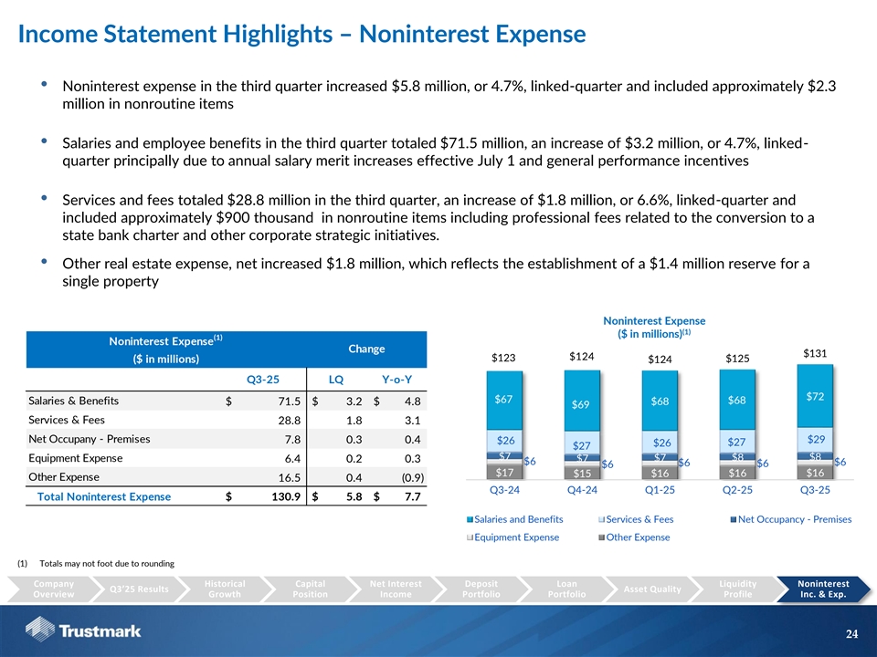 Attractive Diversified Fee Income Business (1) Noninterest Income – Q3-25 (1) (2) (1) Noninterest Income (2) (2) Other, net, 6% Change Wealth ($ in millions) Management, Q3-25 LQ Y-o-Y 25% Service Charges Service Charges on Deposit Accounts on Deposit $ 11.3 $ 0.7 $ (0.0) Accounts, 28% Bank Card and Other Fees 8.3 (0.4) 0.4 Mortgage Banking, net 8.2 (0.4) 2.1 Wealth Management 9.8 0.2 0.5 Other, net 2.4 0.1 (0.6) Total Noninterest Income $ 3 9.9 $ 0.0 $ 2.4 Mortgage Banking, net, Bank Card and 21% Other Fees, 21% (1) Noninterest Income ($ in millions) $43 $41 $39 $39 $38 • Noninterest income in the third quarter totaled $39.9 million, up $41 $11 thousand linked-quarter and $2.4 million year-over-year. $11 $11 $11 $11 • Mortgage banking, net totaled $8.2 million in the third quarter, a decrease $8 $9 $9 $8 of $420 thousand linked-quarter and an increase of $2.1 million year- $8 over-year. The linked-quarter decrease was principally due to lower gain $9 $7 $9 $8 on sales of loans, net and increased net negative hedge ineffectiveness, $6 which was partly offset by increased mortgage servicing income, net. $10 $9 $9 $10 $10 • Wealth Management revenue in the third quarter totaled $9.8 million, an $6 $4 $3 $2 $2 increase of $160 thousand from the prior quarter and a $510 thousand (1) increase from the previous year. Q3-24 Q4-24 Q1-25 Q2-25 Q3-25 Service Charges on Deposit Accounts Bank Card and Other Fees Mortgage Banking, net Wealth Management Other, net (1) Totals may not foot due to rounding Company Historical Capital Net Interest Deposit Loan Liquidity N No on ni in nt te er re es st t Q3’25 Results Asset Quality Overview Growth Position Income Portfolio Portfolio Profile I In nc c. . & & E Ex xp p. . 23