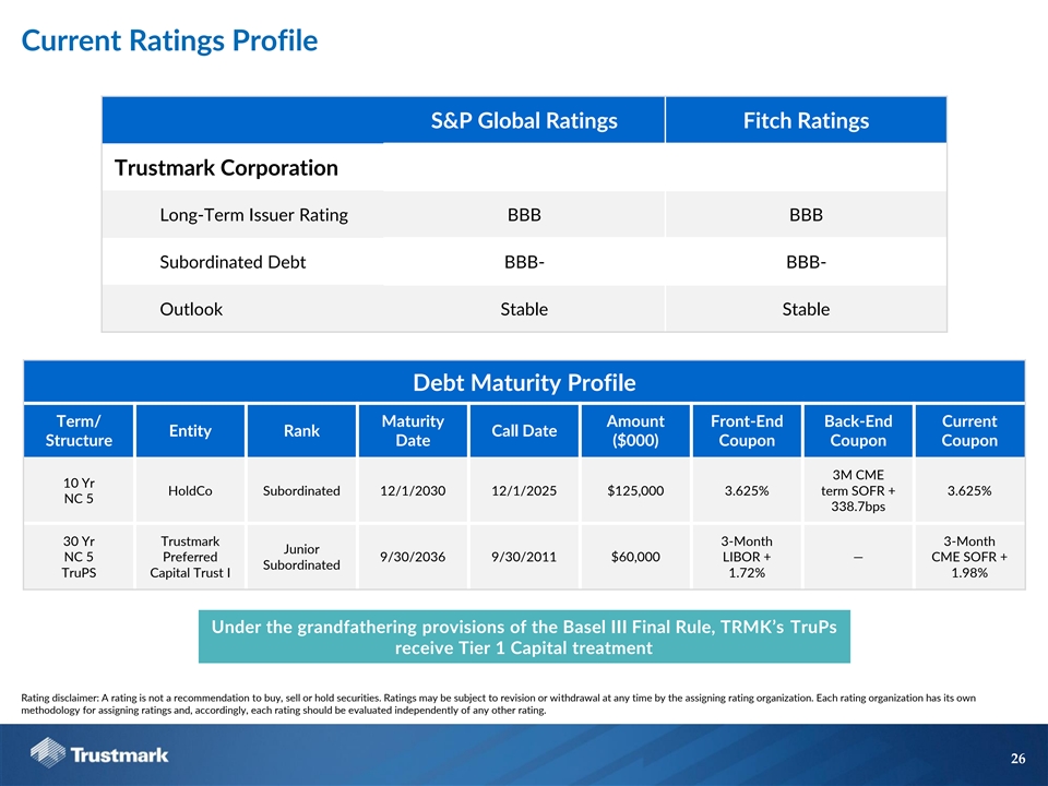 Current Ratings Profile S&P Global Ratings Fitch Ratings Trustmark Corporation Long-Term Issuer Rating BBB BBB Subordinated Debt BBB- BBB- Outlook Stable Stable Debt Maturity Profile Term/ Maturity Amount Front-End Back-End Current Entity Rank Call Date Structure Date ($000) Coupon Coupon Coupon 3M CME 10 Yr HoldCo Subordinated 12/1/2030 12/1/2025 $125,000 3.625% term SOFR + 3.625% NC 5 338.7bps 30 Yr Trustmark 3-Month 3-Month Junior NC 5 Preferred 9/30/2036 9/30/2011 $60,000 LIBOR + — CME SOFR + Subordinated TruPS Capital Trust I 1.72% 1.98% Under the grandfathering provisions of the Basel III Final Rule, TRMK’s TruPs receive Tier 1 Capital treatment Rating disclaimer: A rating is not a recommendation to buy, sell or hold securities. Ratings may be subject to revision or withdrawal at any time by the assigning rating organization. Each rating organization has its own methodology for assigning ratings and, accordingly, each rating should be evaluated independently of any other rating. 26