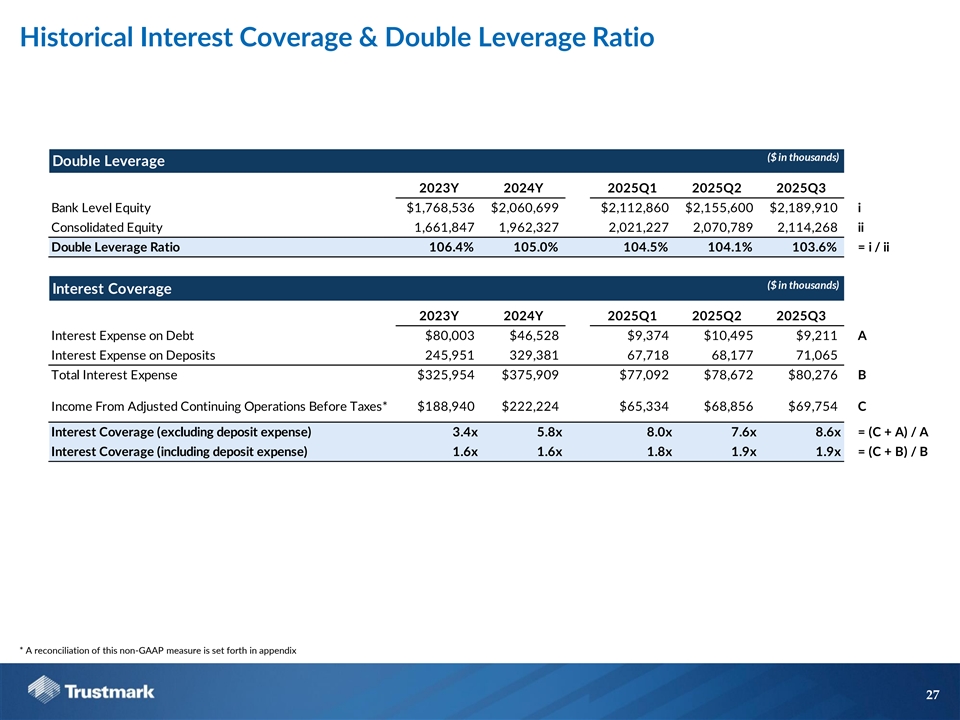 Historical Interest Coverage & Double Leverage Ratio ($ in thousands) Double Leverage 2023Y 2024Y 2025Q1 2025Q2 2025Q3 Bank Level Equity $1,768,536 $2,060,699 $2,112,860 $2,155,600 $2,189,910 i Consolidated Equity 1,661,847 1,962,327 2,021,227 2,070,789 2,114,268 ii Double Leverage Ratio 106.4% 105.0% 104.5% 104.1% 103.6% = i / ii ($ in thousands) Interest Coverage 2023Y 2024Y 2025Q1 2025Q2 2025Q3 Interest Expense on Debt $80,003 $46,528 $9,374 $10,495 $9,211 A Interest Expense on Deposits 245,951 329,381 67,718 68,177 71,065 Total Interest Expense $325,954 $375,909 $77,092 $78,672 $80,276 B Income From Adjusted Continuing Operations Before Taxes* $188,940 $222,224 $65,334 $68,856 $69,754 C Interest Coverage (excluding deposit expense) 3.4x 5.8x 8.0x 7.6x 8.6x = (C + A) / A Interest Coverage (including deposit expense) 1.6x 1.6x 1.8x 1.9x 1.9x = (C + B) / B * A reconciliation of this non-GAAP measure is set forth in appendix 27