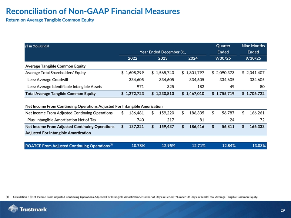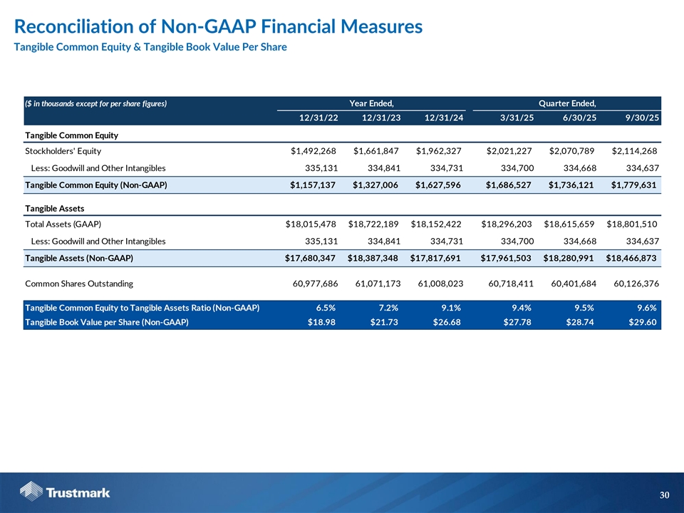 Reconciliation of Non-GAAP Financial Measures Return on Average Tangible Common Equity Quarter Nine Months ($ in thousands) Year Ended December 31, Ended Ended 2022 2023 2024 9/30/25 9/30/25 Average Tangible Common Equity Average Total Shareholders' Equity $ 1,608,299 $ 1,565,740 $ 1,801,797 $ 2,090,373 $ 2,041,407 Less: Average Goodwill 334,605 334,605 334,605 334,605 334,605 Less: Average Identifiable Intangible Assets 971 325 182 49 80 Total Average Tangible Common Equity $ 1,272,723 $ 1,230,810 $ 1,467,010 $ 1,755,719 $ 1,706,722 Net Income From Continuing Operations Adjusted For Intangible Amorization Net Income From Adjusted Continuing Operations $ 136,481 $ 159,220 $ 186,335 $ 56,787 $ 166,261 Plus: Intangible Amortization Net of Tax 740 217 81 24 72 Net Income From Adjusted Continuing Operations $ 137,221 $ 159,437 $ 186,416 $ 56,811 $ 166,333 Adjusted For Intangible Amortization (1) 10.78% 12.95% 12.71% 12.84% 13.03% ROATCE From Adjusted Continuing Operations (1) Calculation = ((Net Income From Adjusted Continuing Operations Adjusted For Intangible Amortization/Number of Days in Period)*Number Of Days in Year)/Total Average Tangible Common Equity. 29