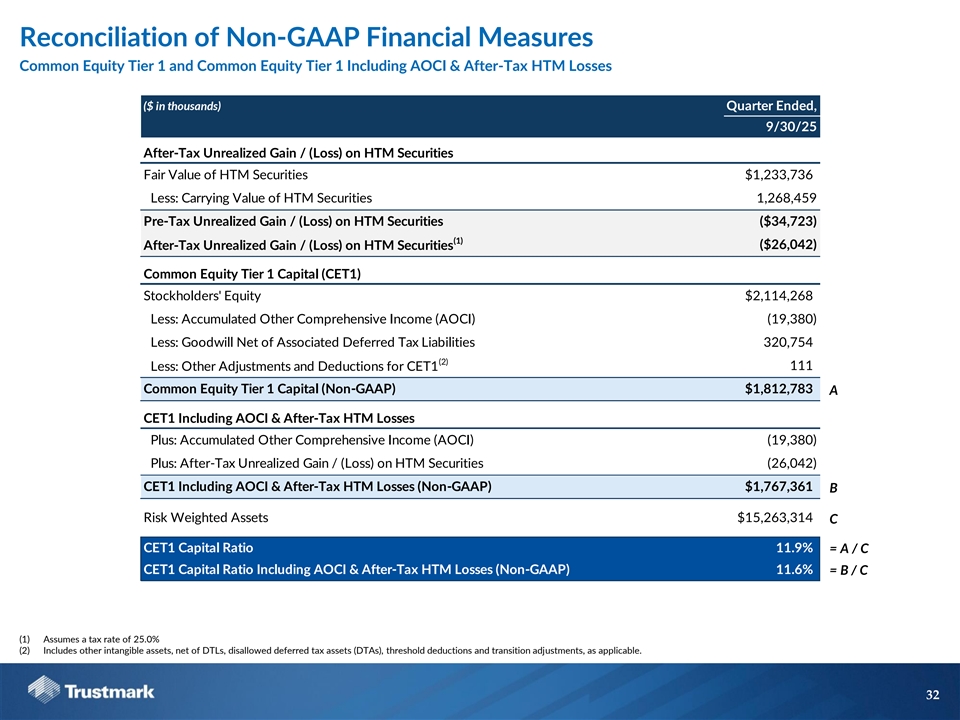 Reconciliation of Non-GAAP Financial Measures Tangible Common Equity & Tangible Assets Including Unrealized Losses on HTM Securities ($ in thousands) Quarter Ended, 9/30/25 After-Tax Unrealized Gain / (Loss) on HTM Securities Fair Value of HTM Securities $1,233,736 Less: Carrying Value of HTM Securities 1,268,459 Pre-Tax Unrealized Gain / (Loss) on HTM Securities ($34,723) (1) ($26,042) After-Tax Unrealized Gain / (Loss) on HTM Securities Tangible Common Equity Including After-Tax HTM Losses Stockholders' Equity $2,114,268 Less: Goodwill and Other Intangibles 334,637 Tangible Common Equity (Non-GAAP) $1,779,631 Plus: After-Tax Unrealized Gain / (Loss) on HTM Securities (26,042) Tangible Common Equity Including After-Tax HTM Losses (Non-GAAP) $1,753,589 Tangible Assets Including After-Tax HTM Losses Total Assets (GAAP) $18,801,510 Less: Goodwill and Other Intangibles 334,637 Tangible Assets (Non-GAAP) $18,466,873 Plus: After-Tax Unrealized Gain / (Loss) on HTM Securities (26,042) Tangible Assets Including After-Tax HTM Losses (Non-GAAP) $18,440,831 Tangible Common Equity to Tangible Assets Ratio Including After-Tax HTM Losses (Non-GAAP) 9.5% (1) Assumes a tax rate of 25.0% 31