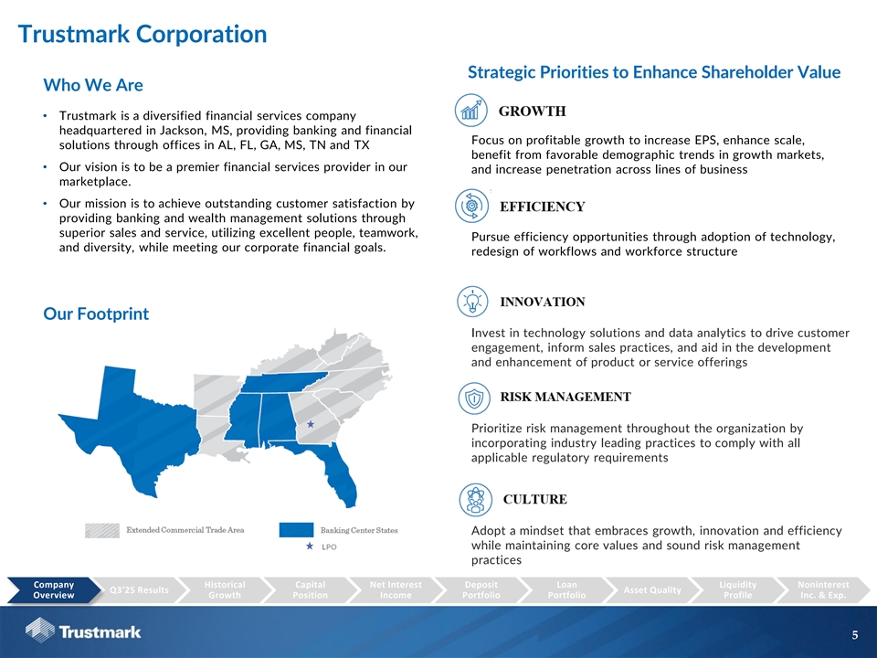 Today’s Presenters v• Mr. Dewey, with 40 years of banking experience, was named President and CEO in January 2021. Mr. Dewey Duane Dewey joined Trustmark in 2003 as President of Wealth Management and assumed additional responsibilities for Commercial Real Estate, Institutional Banking, Corporate Banking, and Treasury Management. In 2019, Mr. Dewey President, Chief Executive Officer was named Chief Operating Officer and, in 2020, became President and COO and joined the Board of Directors. • Prior to joining Trustmark, Mr. Dewey served as Managing Director of Wealth Management at Provident Bank in Trustmark Corporation Cincinnati, OH, and at Bank of America in Corporate Banking in Dallas, TX and in Private Banking in Washington, Trustmark Bank DC. Tom Owens • Mr. Owens was named Chief Financial Officer effective March 2021. Treasurer, Principal Financial Officer • Joined Trustmark in 2013, initially serving as Executive Vice President and Bank Treasurer. Trustmark Corporation • Prior experience includes over 25 years in financial leadership roles at other leading banking organizations, including KeyBank and Wachovia. Executive VP, Chief Financial Officer Trustmark Bank • Mr. Harvey serves as Executive Vice President and Chief Credit and Operations Officer at Trustmark, having Barry Harvey joined the company in 1999. Executive VP, Chief Credit and Operations Officer • Directs all credit, IT, and operational activities and provides strategic guidance for the bank's lending and deposit functions. • Prior experience includes 38 years in the financial services industry with expertise in portfolio management Trustmark Bank and credit analysis. Tom Chambers • Mr. Chambers serves as Executive Vice President and Chief Accounting Officer for Trustmark Bank and serves as the Principal Accounting Officer for Trustmark Corporation, having joined the company in 2002. Principal Accounting Officer • As Chief Accounting Officer, Mr. Chambers oversees Accounting, which includes Securities Exchange Trustmark Corporation Commission and Regulatory external reporting, Corporate Taxes, Accounts Payable, and Strategic Sourcing. Executive VP, Chief Accounting Officer • Mr. Chambers previously served as Director of Finance of Mississippi for BellSouth Mobility. Trustmark Bank • Mr. Tate, Jr. was named Chief Administrative Officer effective January 2021. Granville Tate, Jr. • Joined Trustmark in 2015, overseeing the Corporate Governance, Risk Management, Corporate Security, Secretary Facilities, Asset Review and Legal areas of the organization. Trustmark Corporation • Also serves as Secretary of Trustmark Corporation and Trustmark Bank. • Prior experience includes over 30 years in private legal practice, with a focus on Banking, Corporate, and Executive VP, Chief Administrative Officer, Secretary Finance Law. Trustmark Bank Joey Rein • Mr. Rein serves as Director of Corporate Strategy, responsible for M&A, strategic planning, and investor relations, having joined the company in 1998. Assistant Secretary • Also serves as Assistant Secretary of Trustmark Corporation and Trustmark Bank, managing corporate Trustmark Corporation governance duties. Executive VP, Director of Corporate Strategy • Prior experience in Corporate Planning and Development at Deposit Guaranty Corp. Trustmark Bank C Co om mp pa an ny y Historical Capital Net Interest Deposit Loan Liquidity Noninterest Q3’25 Results Asset Quality O Ov ve er rv vi ie ew w Growth Position Income Portfolio Portfolio Profile Inc. & Exp. 4