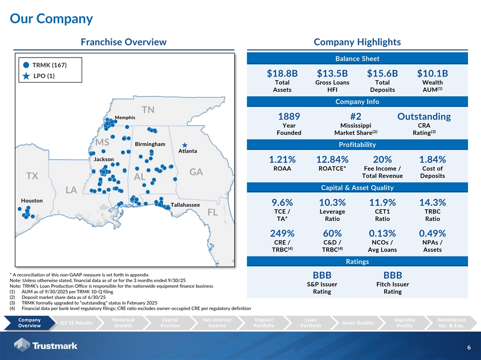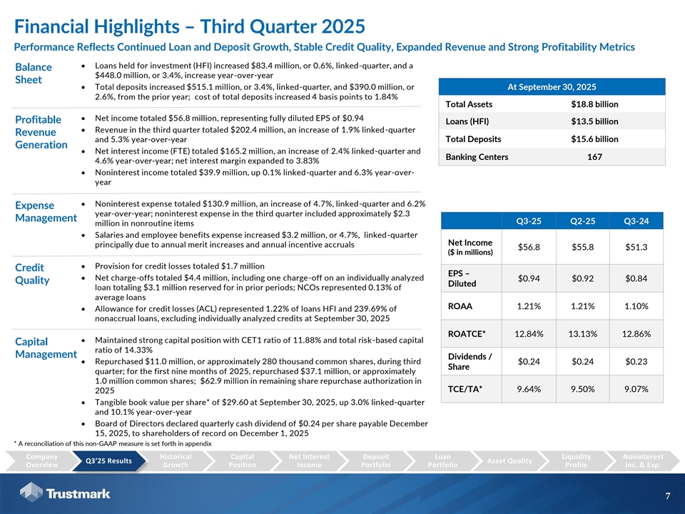 Our Company Franchise Overview Company Highlights Balance Sheet TRMK (167) $18.8B $13.5B $15.6B $10.1B LPO (1) Total Gross Loans Total Wealth (1) Assets HFI Deposits AUM Company Info TN Memphis 1889 #2 Outstanding Year Mississippi CRA (2) (3) Founded Market Share Rating MS Birmingham Profitability Atlanta Jackson 1.21% 12.84% 20% 1.84% ROAA ROATCE* Fee Income / Cost of GA Total Revenue Deposits TX AL Capital & Asset Quality LA Houston 9.6% 10.3% 11.9% 14.3% Tallahassee TCE / Leverage CET1 TRBC FL TA* Ratio Ratio Ratio 249% 60% 0.13% 0.49% CRE / C&D / NCOs / NPAs / (4) (4) TRBC TRBC Avg Loans Assets Ratings * A reconciliation of this non-GAAP measure is set forth in appendix BBB BBB Note: Unless otherwise stated, financial data as of or for the 3 months ended 9/30/25 S&P Issuer Fitch Issuer Note: TRMK’s Loan Production Office is responsible for the nationwide equipment finance business (1) AUM as of 9/30/2025 per TRMK 10-Q filing Rating Rating (2) Deposit market share data as of 6/30/25 (3) TRMK formally upgraded to “outstanding” status in February 2025 (4) Financial data per bank level regulatory filings; CRE ratio excludes owner-occupied CRE per regulatory definition C Co om mp pa an ny y Historical Capital Net Interest Deposit Loan Liquidity Noninterest Q3’25 Results Asset Quality O Ov ve er rv vi ie ew w Growth Position Income Portfolio Portfolio Profile Inc. & Exp. 6