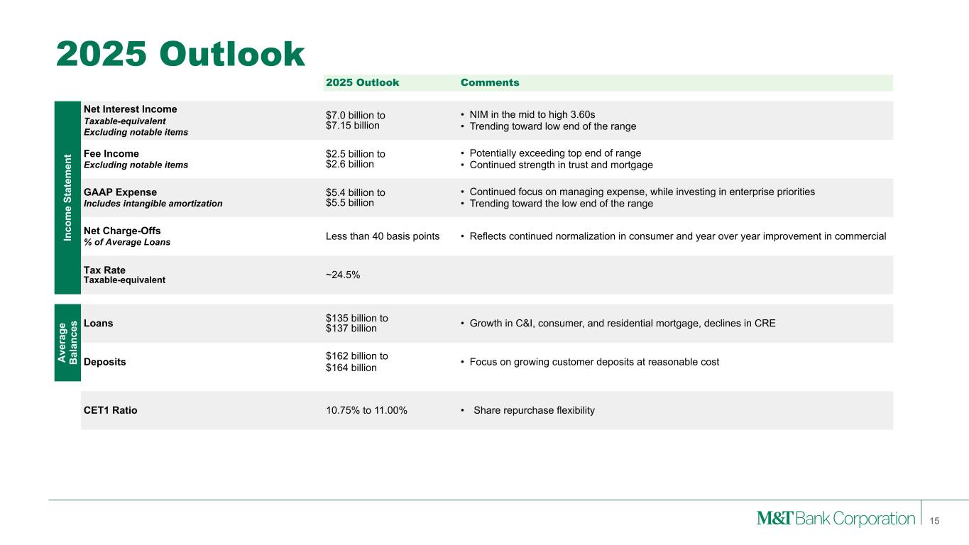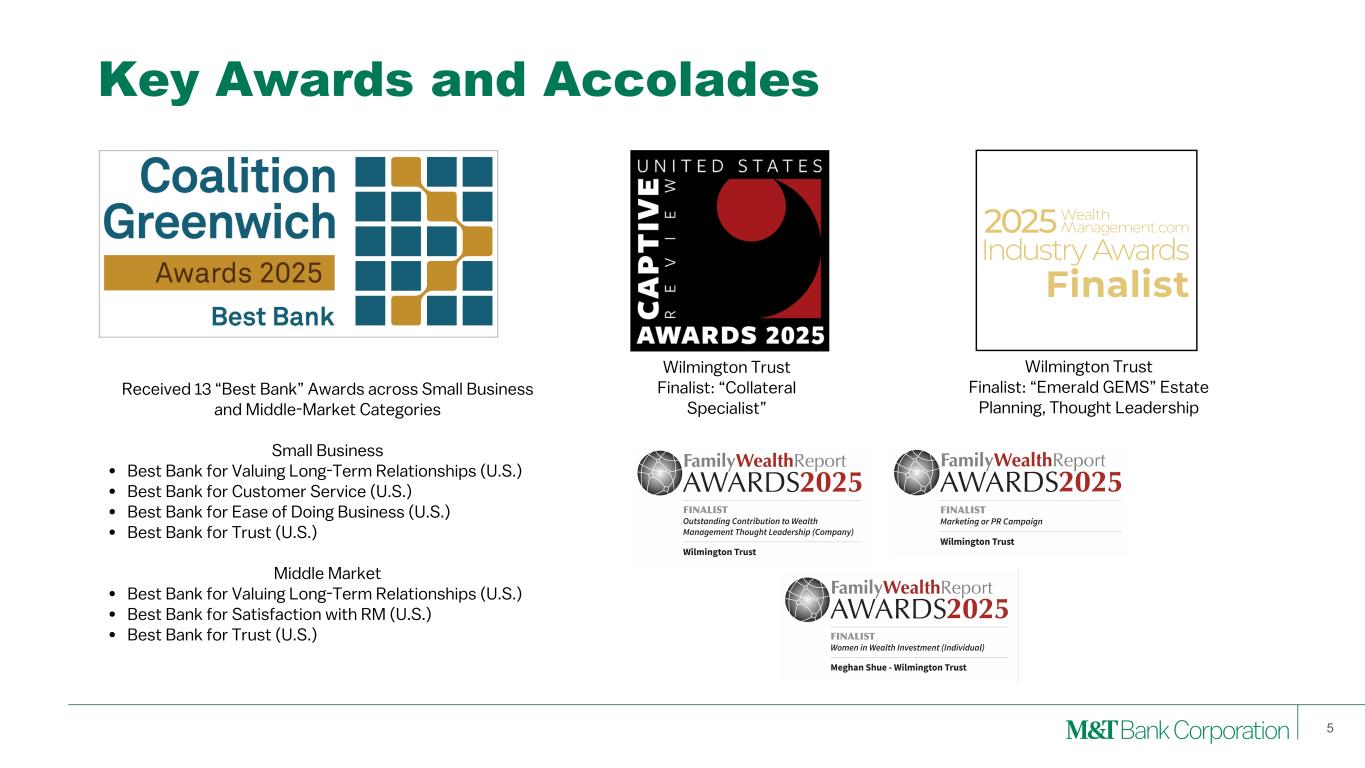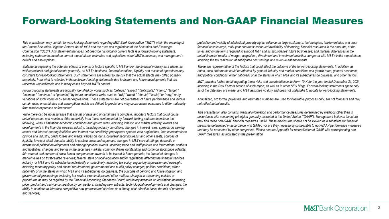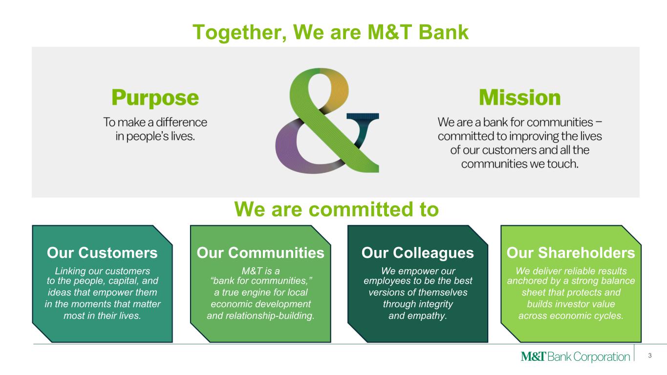 Forward-Looking Statements and Non-GAAP Financial Measures 2 This presentation may contain forward-looking statements regarding M&T Bank Corporation (“M&T”) within the meaning of the Private Securities Litigation Reform Act of 1995 and the rules and regulations of the Securities and Exchange Commission (“SEC”). Any statement that does not describe historical or current facts is a forward-looking statement, including statements based on current expectations, estimates and projections about M&T's business, and management's beliefs and assumptions. Statements regarding the potential effects of events or factors specific to M&T and/or the financial industry as a whole, as well as national and global events generally, on M&T's business, financial condition, liquidity and results of operations may constitute forward-looking statements. Such statements are subject to the risk that the actual effects may differ, possibly materially, from what is reflected in those forward-looking statements due to factors and future developments that are uncertain, unpredictable and in many cases beyond M&T's control. Forward-looking statements are typically identified by words such as "believe," "expect," "anticipate," "intend," "target," "estimate," "continue," or "potential," by future conditional verbs such as "will," "would," "should," "could," or "may," or by variations of such words or by similar expressions. These statements are not guarantees of future performance and involve certain risks, uncertainties and assumptions which are difficult to predict and may cause actual outcomes to differ materially from what is expressed or forecasted. While there can be no assurance that any list of risks and uncertainties is complete, important factors that could cause actual outcomes and results to differ materially from those contemplated by forward-looking statements include the following, without limitation: economic conditions and growth rates, including inflation and market volatility; events and developments in the financial services industry, including industry conditions; changes in interest rates, spreads on earning assets and interest-bearing liabilities, and interest rate sensitivity; prepayment speeds, loan originations, loan concentrations by type and industry, credit losses and market values on loans, collateral securing loans, and other assets; sources of liquidity; levels of client deposits; ability to contain costs and expenses; changes in M&T's credit ratings; domestic or international political developments and other geopolitical events, including trade and tariff policies and international conflicts and hostilities; changes and trends in the securities markets; common shares outstanding and common stock price volatility; fair value of and number of stock-based compensation awards to be issued in future periods; the impact of changes in market values on trust-related revenues; federal, state or local legislation and/or regulations affecting the financial services industry, or M&T and its subsidiaries individually or collectively, including tax policy; regulatory supervision and oversight, including monetary policy and capital requirements; governmental and public policy changes; political conditions, either nationally or in the states in which M&T and its subsidiaries do business; the outcome of pending and future litigation and governmental proceedings, including tax-related examinations and other matters; changes in accounting policies or procedures as may be required by the Financial Accounting Standards Board, regulatory agencies or legislation; increasing price, product and service competition by competitors, including new entrants; technological developments and changes; the ability to continue to introduce competitive new products and services on a timely, cost-effective basis; the mix of products and services; protection and validity of intellectual property rights; reliance on large customers; technological, implementation and cost/ financial risks in large, multi-year contracts; continued availability of financing; financial resources in the amounts, at the times and on the terms required to support M&T and its subsidiaries' future businesses; and material differences in the actual financial results of merger, acquisition, divestment and investment activities compared with M&T's initial expectations, including the full realization of anticipated cost savings and revenue enhancements. These are representative of the factors that could affect the outcome of the forward-looking statements. In addition, as noted, such statements could be affected by general industry and market conditions and growth rates, general economic and political conditions, either nationally or in the states in which M&T and its subsidiaries do business, and other factors. M&T provides further detail regarding these risks and uncertainties in its Form 10-K for the year ended December 31, 2024, including in the Risk Factors section of such report, as well as in other SEC filings. Forward-looking statements speak only as of the date they are made, and M&T assumes no duty and does not undertake to update forward-looking statements. Annualized, pro forma, projected, and estimated numbers are used for illustrative purposes only, are not forecasts and may not reflect actual results. This presentation also contains financial information and performance measures determined by methods other than in accordance with accounting principles generally accepted in the United States ("GAAP"). Management believes investors may find these non-GAAP financial measures useful. These disclosures should not be viewed as a substitute for financial measures determined in accordance with GAAP, nor are they necessarily comparable to non-GAAP performance measures that may be presented by other companies. Please see the Appendix for reconciliation of GAAP with corresponding non- GAAP measures, as indicated in the presentation.