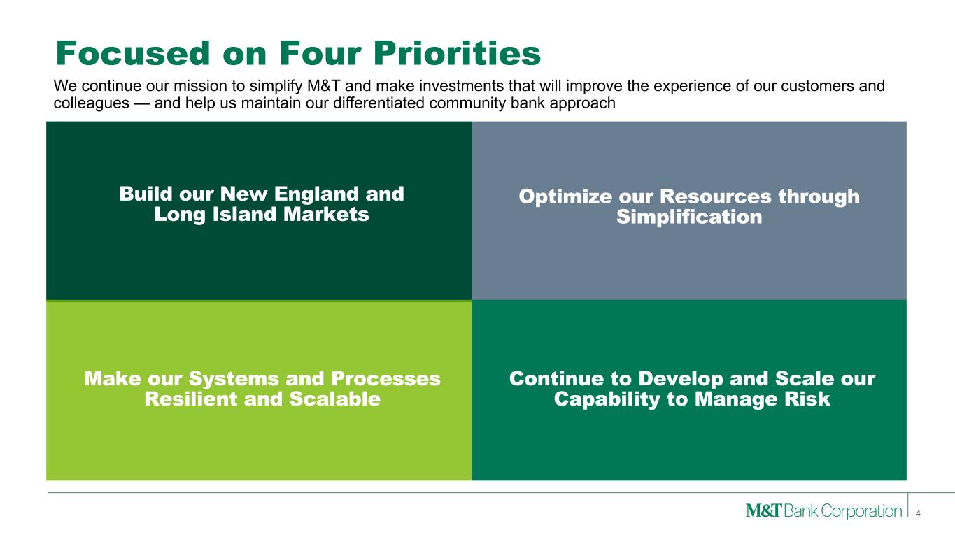 Our Customers Linking our customers to the people, capital, and ideas that empower them in the moments that matter most in their lives. Our Communities M&T is a “bank for communities,” a true engine for local economic development and relationship-building. Our Colleagues We empower our employees to be the best versions of themselves through integrity and empathy. We are committed to Our Shareholders We deliver reliable results anchored by a strong balance sheet that protects and builds investor value across economic cycles. Together, We are M&T Bank 3