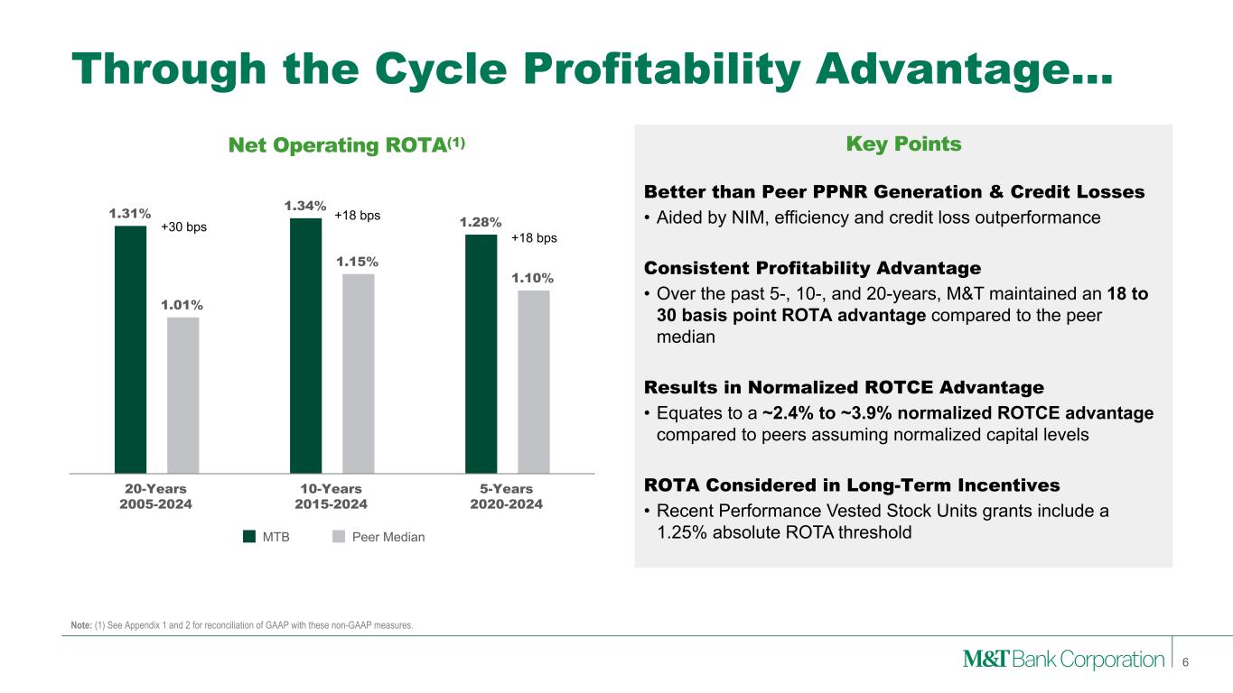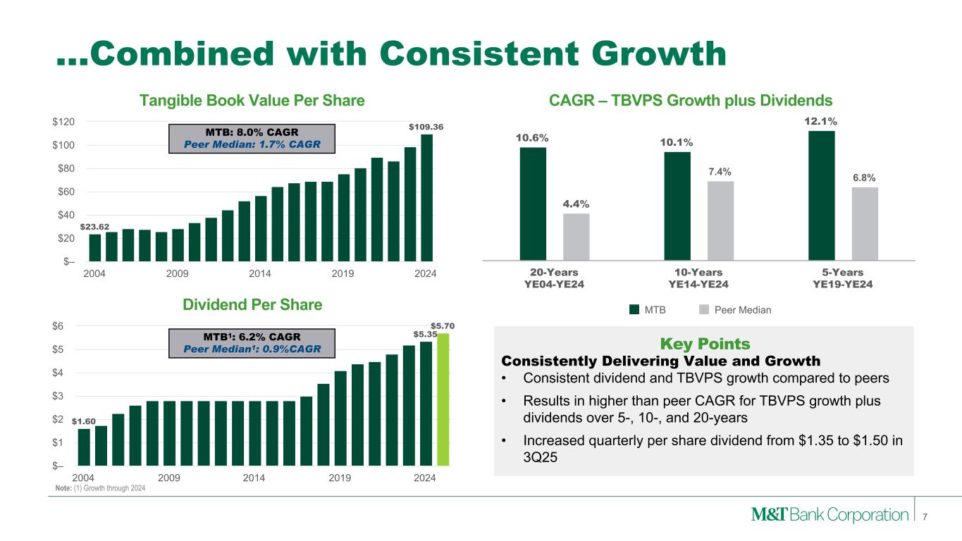1.31% 1.34% 1.28% 1.01% 1.15% 1.10% MTB Peer Median 20-Years 2005-2024 10-Years 2015-2024 5-Years 2020-2024 Through the Cycle Profitability Advantage… 6 Note: (1) See Appendix 1 and 2 for reconciliation of GAAP with these non-GAAP measures. Net Operating ROTA(1) Better than Peer PPNR Generation & Credit Losses • Aided by NIM, efficiency and credit loss outperformance Consistent Profitability Advantage • Over the past 5-, 10-, and 20-years, M&T maintained an 18 to 30 basis point ROTA advantage compared to the peer median Results in Normalized ROTCE Advantage • Equates to a ~2.4% to ~3.9% normalized ROTCE advantage compared to peers assuming normalized capital levels ROTA Considered in Long-Term Incentives • Recent Performance Vested Stock Units grants include a 1.25% absolute ROTA threshold Key Points +30 bps +18 bps +18 bps