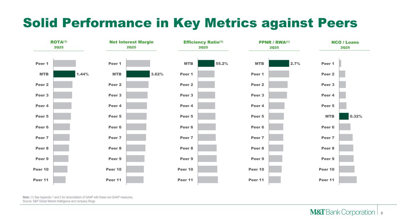 2020 2021 2022 2023 2024 1H25 Superior Pre-Credit Earnings Net Interest Margin 3.16 % 2.76 % 3.39 % 3.83 % 3.58 % 3.64 % Efficiency Ratio (1) 56.3 % 59.0 % 56.6 % 54.9 % 56.9 % 57.8 % PPNR ($, Millions) (1) $2,579 $2,445 $3,471 $4,232 $3,979 $1,943 PPNR to RWA (1) 2.4 % 2.3 % 2.7 % 2.8 % 2.6 % 2.5 % Strong Credit Metrics Allowance to Loans (As At) 1.76 % 1.58 % 1.46 % 1.59 % 1.61 % 1.61 % Net Charge-Offs to Loans 0.26 % 0.20 % 0.13 % 0.33 % 0.41 % 0.33 % Focused on Returns Net Operating Return on: Tangible Assets (1) 1.04 % 1.28 % 1.35 % 1.42 % 1.30 % 1.32 % Tangible Common Equity (1) 12.79 % 16.80 % 16.70 % 17.60 % 14.54 % 14.03 % Consistent Capital Generation (As At) Tangible Common Equity to Tangible Assets 7.49 % 7.68 % 7.63 % 8.20 % 9.07 % 8.67 % Common Equity Tier 1 Ratio 10.00 % 11.42 % 10.44 % 10.98 % 11.68 % 10.99 % Tier 1 Capital Ratio 11.17 % 13.11 % 11.79 % 12.29 % 13.21 % 12.50 % Balance Sheet (As At) Loans to Deposits 82.25 % 70.63 % 80.46 % 82.11 % 84.16 % 82.77 % Securities to Assets 4.94 % 4.61 % 12.56 % 12.91 % 16.36 % 16.81 % Key Ratios 8 Note: (1) See Appendix 1 and 2 for reconciliation of GAAP with these non-GAAP measures.