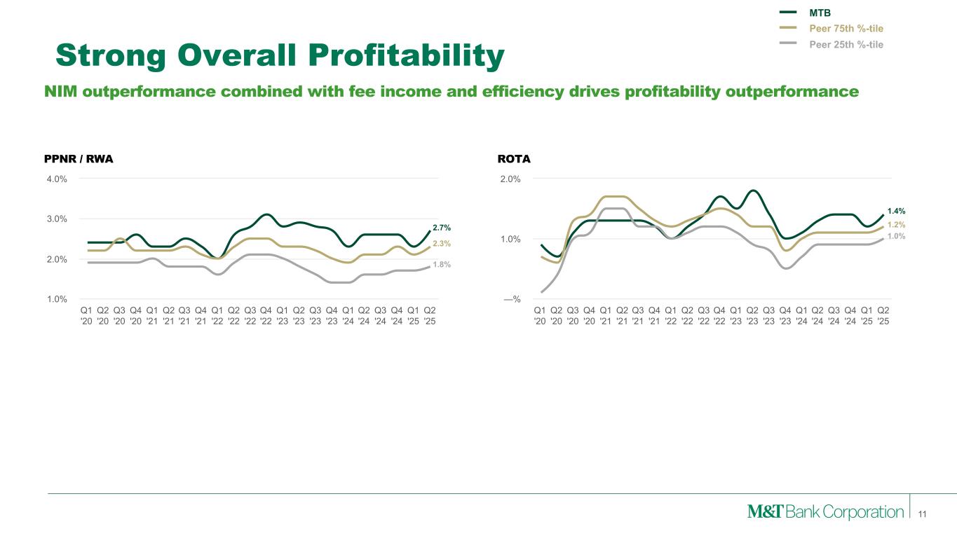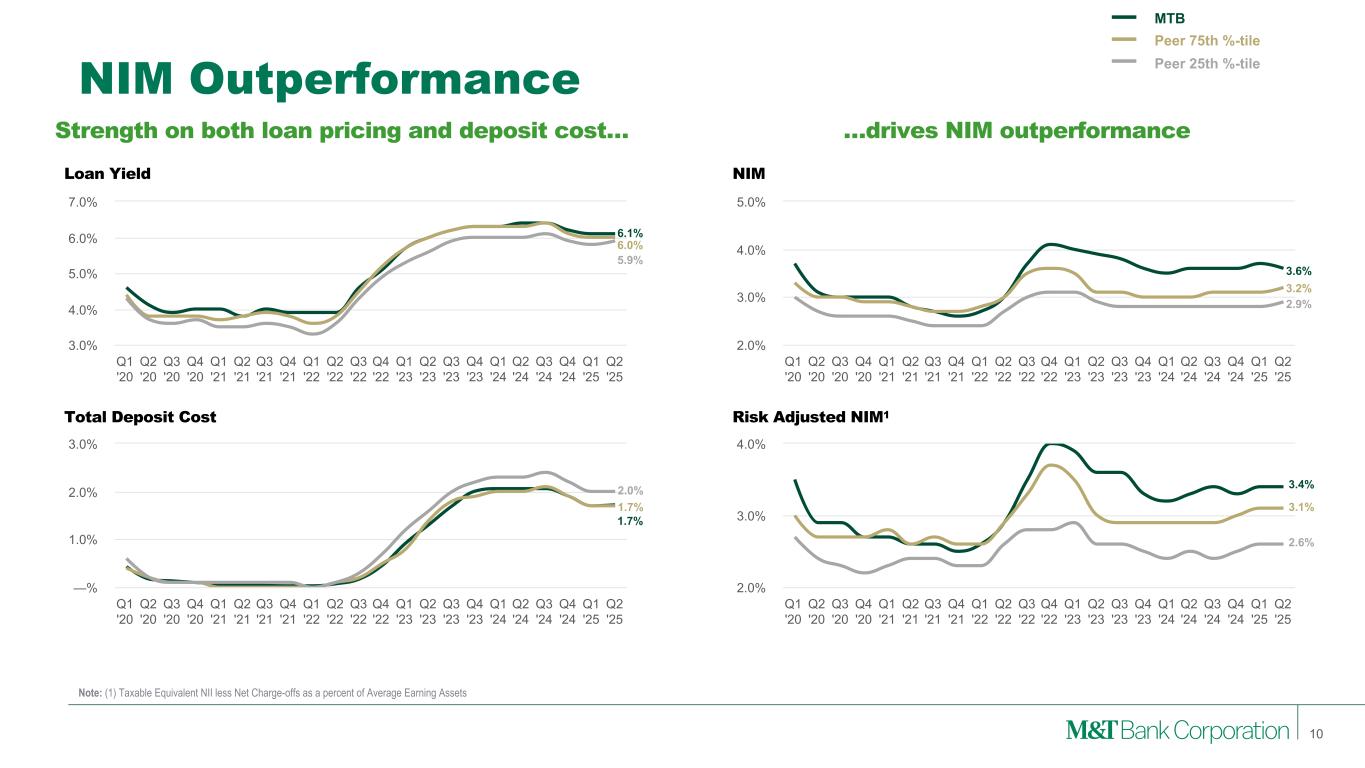 NIM Outperformance Strength on both loan pricing and deposit cost… …drives NIM outperformance Q1 '20 Q2 '20 Q3 '20 Q4 '20 Q1 '21 Q2 '21 Q3 '21 Q4 '21 Q1 '22 Q2 '22 Q3 '22 Q4 '22 Q1 '23 Q2 '23 Q3 '23 Q4 '23 Q1 '24 Q2 '24 Q3 '24 Q4 '24 Q1 '25 Q2 '25 2.0% 3.0% 4.0% 5.0% NIMLoan Yield Q1 '20 Q2 '20 Q3 '20 Q4 '20 Q1 '21 Q2 '21 Q3 '21 Q4 '21 Q1 '22 Q2 '22 Q3 '22 Q4 '22 Q1 '23 Q2 '23 Q3 '23 Q4 '23 Q1 '24 Q2 '24 Q3 '24 Q4 '24 Q1 '25 Q2 '25 3.0% 4.0% 5.0% 6.0% 7.0% Total Deposit Cost Q1 '20 Q2 '20 Q3 '20 Q4 '20 Q1 '21 Q2 '21 Q3 '21 Q4 '21 Q1 '22 Q2 '22 Q3 '22 Q4 '22 Q1 '23 Q2 '23 Q3 '23 Q4 '23 Q1 '24 Q2 '24 Q3 '24 Q4 '24 Q1 '25 Q2 '25 —% 1.0% 2.0% 3.0% Risk Adjusted NIM1 Q1 '20 Q2 '20 Q3 '20 Q4 '20 Q1 '21 Q2 '21 Q3 '21 Q4 '21 Q1 '22 Q2 '22 Q3 '22 Q4 '22 Q1 '23 Q2 '23 Q3 '23 Q4 '23 Q1 '24 Q2 '24 Q3 '24 Q4 '24 Q1 '25 Q2 '25 2.0% 3.0% 4.0% 6.1% 6.0% 5.9% 1.7% 1.7% 2.0% 3.6% 3.2% 2.9% 3.4% 3.1% 2.6% Note: (1) Taxable Equivalent NII less Net Charge-offs as a percent of Average Earning Assets MTB Peer 75th %-tile Peer 25th %-tile 10
