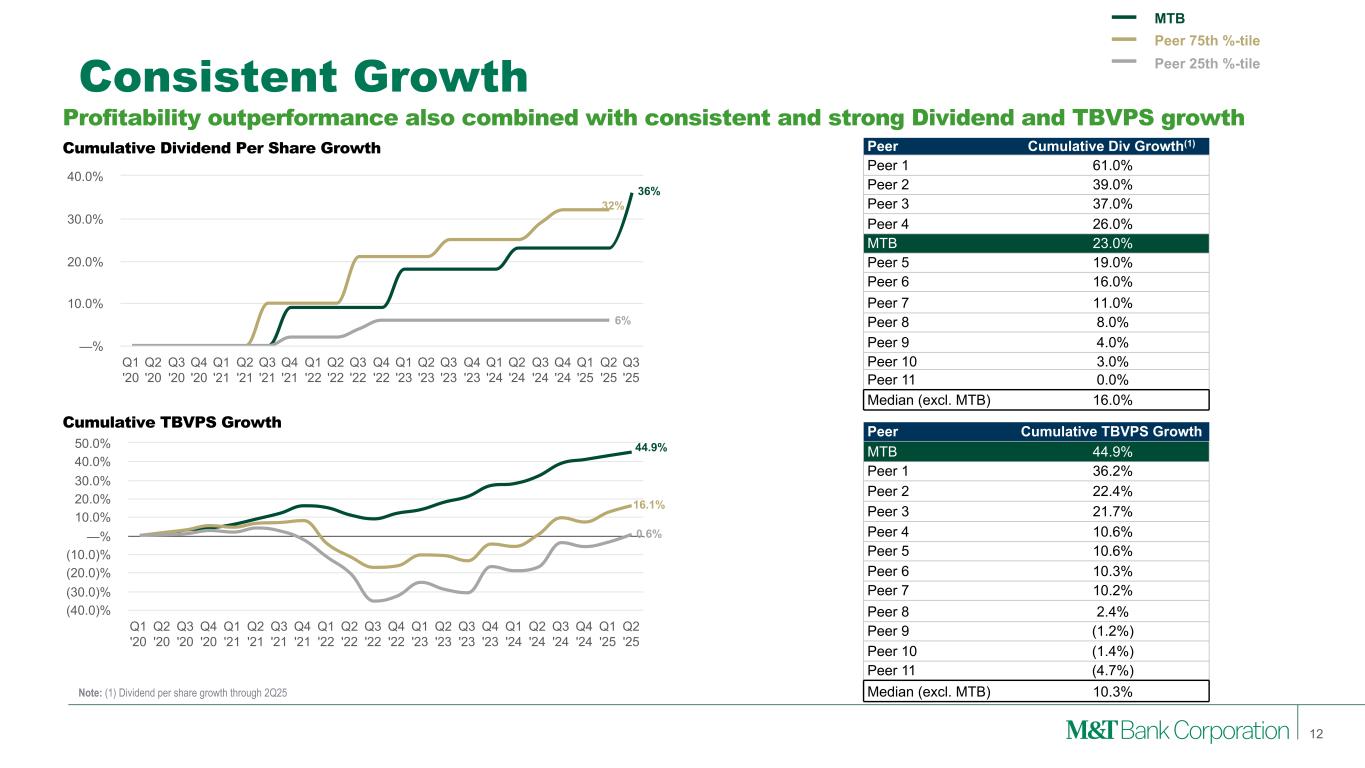 Strong Overall Profitability NIM outperformance combined with fee income and efficiency drives profitability outperformance PPNR / RWA ROTA Q1 '20 Q2 '20 Q3 '20 Q4 '20 Q1 '21 Q2 '21 Q3 '21 Q4 '21 Q1 '22 Q2 '22 Q3 '22 Q4 '22 Q1 '23 Q2 '23 Q3 '23 Q4 '23 Q1 '24 Q2 '24 Q3 '24 Q4 '24 Q1 '25 Q2 '25 1.0% 2.0% 3.0% 4.0% Q1 '20 Q2 '20 Q3 '20 Q4 '20 Q1 '21 Q2 '21 Q3 '21 Q4 '21 Q1 '22 Q2 '22 Q3 '22 Q4 '22 Q1 '23 Q2 '23 Q3 '23 Q4 '23 Q1 '24 Q2 '24 Q3 '24 Q4 '24 Q1 '25 Q2 '25 —% 1.0% 2.0% 2.7% 2.3% 1.8% 1.4% 1.2% 1.0% MTB Peer 75th %-tile Peer 25th %-tile 11