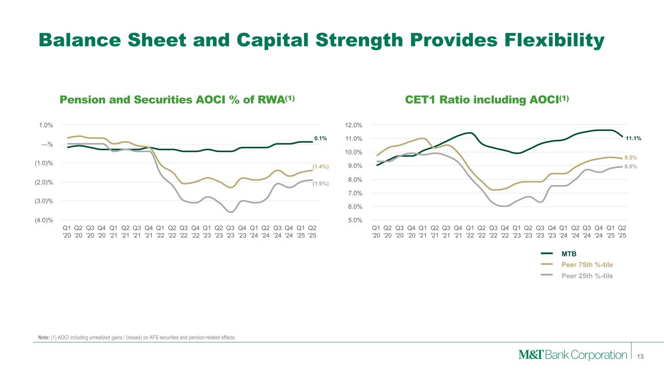Consistent Growth Profitability outperformance also combined with consistent and strong Dividend and TBVPS growth Cumulative Dividend Per Share Growth Q1 '20 Q2 '20 Q3 '20 Q4 '20 Q1 '21 Q2 '21 Q3 '21 Q4 '21 Q1 '22 Q2 '22 Q3 '22 Q4 '22 Q1 '23 Q2 '23 Q3 '23 Q4 '23 Q1 '24 Q2 '24 Q3 '24 Q4 '24 Q1 '25 Q2 '25 Q3 '25 —% 10.0% 20.0% 30.0% 40.0% Cumulative TBVPS Growth Q1 '20 Q2 '20 Q3 '20 Q4 '20 Q1 '21 Q2 '21 Q3 '21 Q4 '21 Q1 '22 Q2 '22 Q3 '22 Q4 '22 Q1 '23 Q2 '23 Q3 '23 Q4 '23 Q1 '24 Q2 '24 Q3 '24 Q4 '24 Q1 '25 Q2 '25 (40.0)% (30.0)% (20.0)% (10.0)% —% 10.0% 20.0% 30.0% 40.0% 50.0% Peer Cumulative Div Growth(1) Peer 1 61.0% Peer 2 39.0% Peer 3 37.0% Peer 4 26.0% MTB 23.0% Peer 5 19.0% Peer 6 16.0% Peer 7 11.0% Peer 8 8.0% Peer 9 4.0% Peer 10 3.0% Peer 11 0.0% Median (excl. MTB) 16.0% Peer Cumulative TBVPS Growth MTB 44.9% Peer 1 36.2% Peer 2 22.4% Peer 3 21.7% Peer 4 10.6% Peer 5 10.6% Peer 6 10.3% Peer 7 10.2% Peer 8 2.4% Peer 9 (1.2%) Peer 10 (1.4%) Peer 11 (4.7%) Median (excl. MTB) 10.3% 36% 32% 6% 44.9% 16.1% 0.6% Note: (1) Dividend per share growth through 2Q25 MTB Peer 75th %-tile Peer 25th %-tile 12