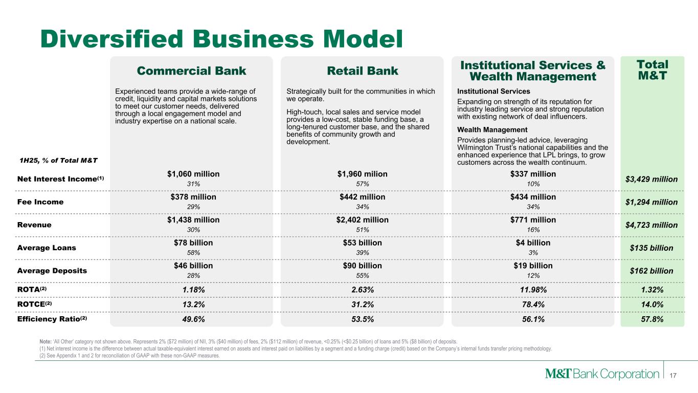 Diversified Business Model with Fee Income Momentum Diversified Loan Portfolio with a History of Credit Outperformance Positive Recent Trends in Nonaccrual and Criticized Granular and Broad-Based Core Deposit Funding & Strong Liquidity Strong Capital and Low AOCI Impact High Quality Securities Portfolio Our Focus on the Fundamentals 16