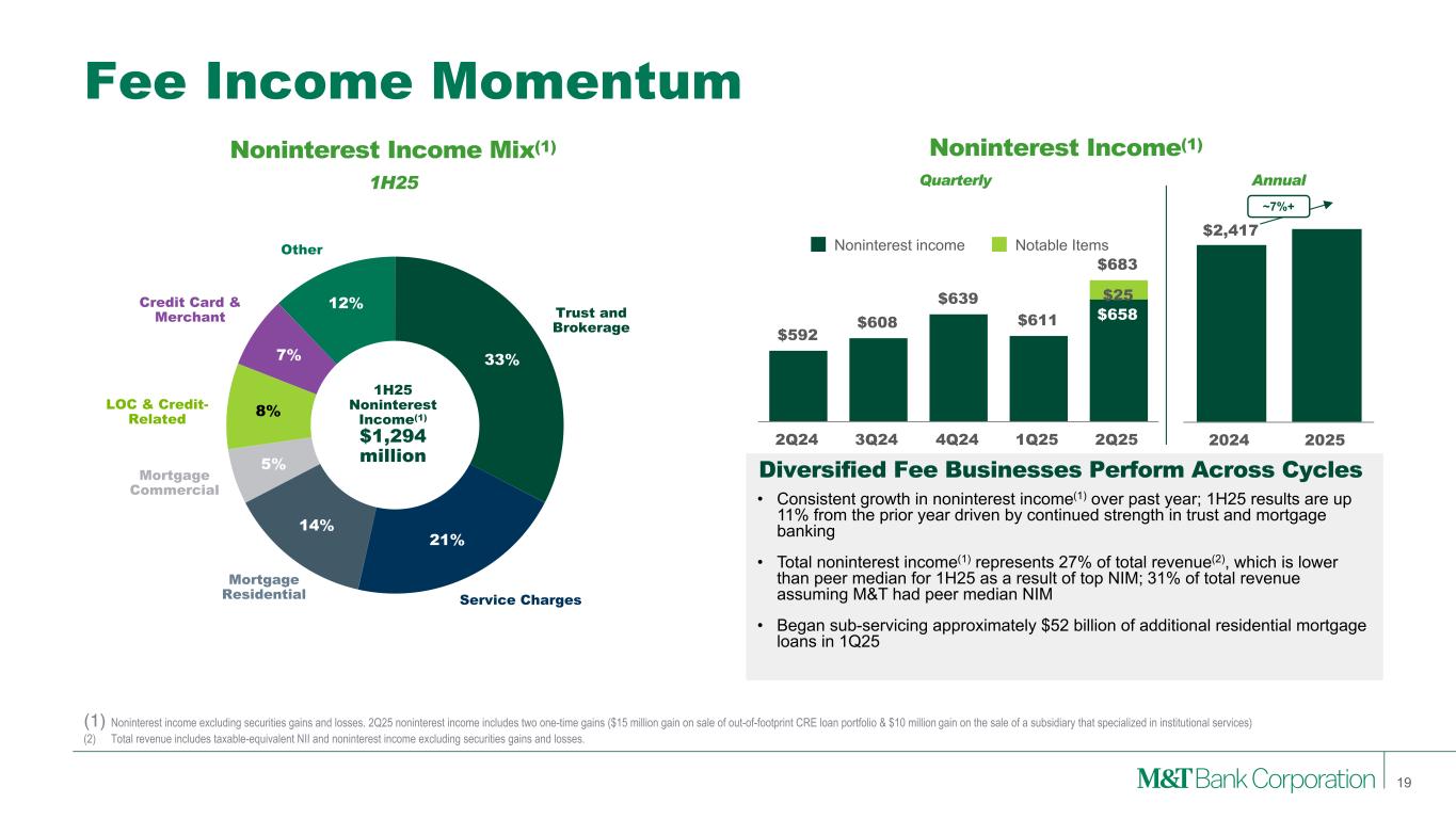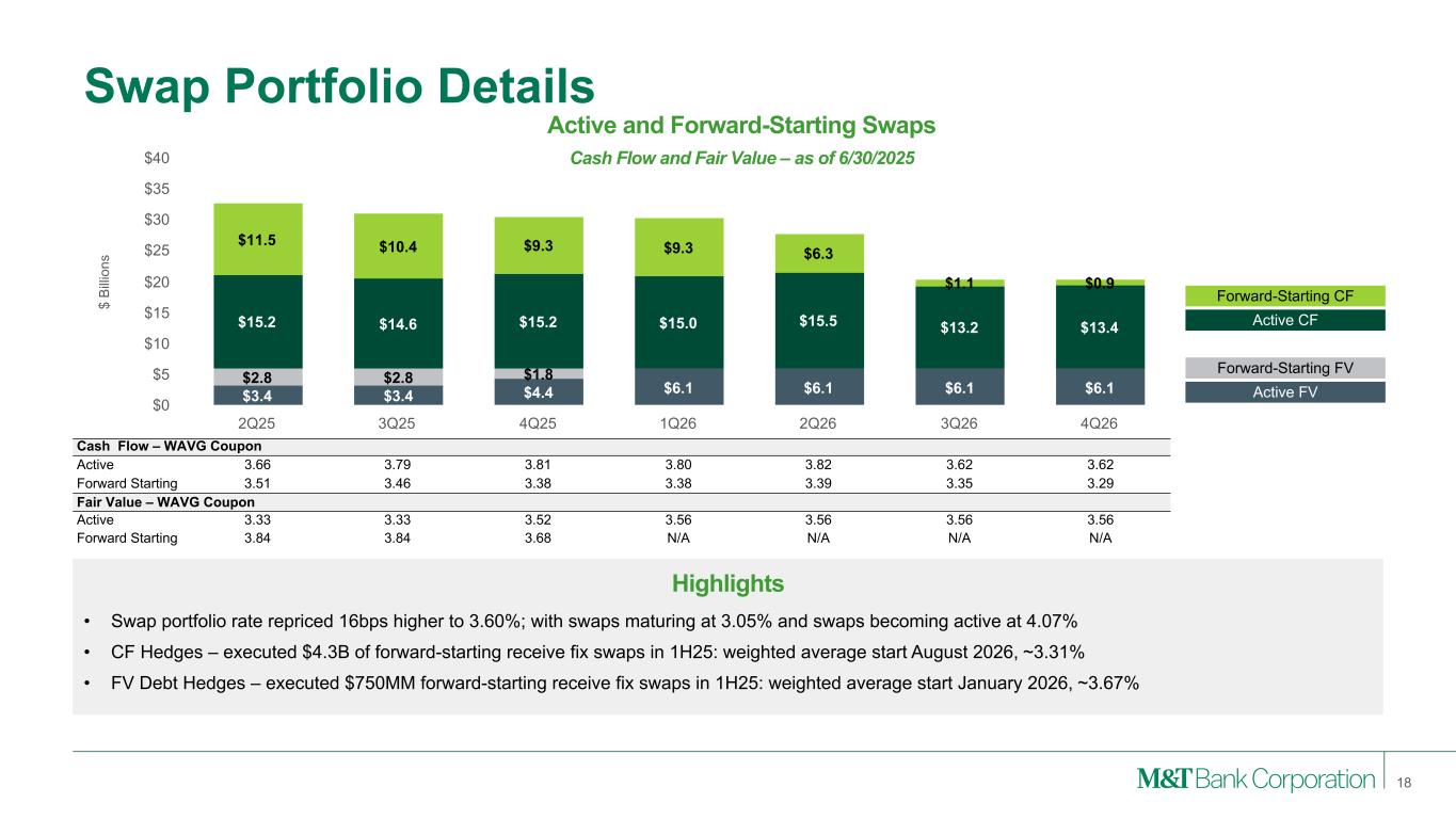 Diversified Business Model Experienced teams provide a wide-range of credit, liquidity and capital markets solutions to meet our customer needs, delivered through a local engagement model and industry expertise on a national scale. Strategically built for the communities in which we operate. High-touch, local sales and service model provides a low-cost, stable funding base, a long-tenured customer base, and the shared benefits of community growth and development. 17 Institutional Services Expanding on strength of its reputation for industry leading service and strong reputation with existing network of deal influencers. Wealth Management Provides planning-led advice, leveraging Wilmington Trust’s national capabilities and the enhanced experience that LPL brings, to grow customers across the wealth continuum. Note: ‘All Other’ category not shown above. Represents 2% ($72 million) of NII, 3% ($40 million) of fees, 2% ($112 million) of revenue, <0.25% (<$0.25 billion) of loans and 5% ($8 billion) of deposits. (1) Net interest income is the difference between actual taxable-equivalent interest earned on assets and interest paid on liabilities by a segment and a funding charge (credit) based on the Company’s internal funds transfer pricing methodology. (2) See Appendix 1 and 2 for reconciliation of GAAP with these non-GAAP measures. Commercial Bank Retail Bank Institutional Services & Wealth Management Net Interest Income(1) $1,060 million $1,960 milion $337 million $3,429 million31% 57% 10% Fee Income $378 million $442 million $434 million $1,294 million29% 34% 34% Revenue $1,438 million $2,402 million $771 million $4,723 million30% 51% 16% Average Loans $78 billion $53 billion $4 billion $135 billion58% 39% 3% Average Deposits $46 billion $90 billion $19 billion $162 billion28% 55% 12% ROTA(2) 1.18% 2.63% 11.98% 1.32% ROTCE(2) 13.2% 31.2% 78.4% 14.0% Efficiency Ratio(2) 49.6% 53.5% 56.1% 57.8% 1H25, % of Total M&T Total M&T