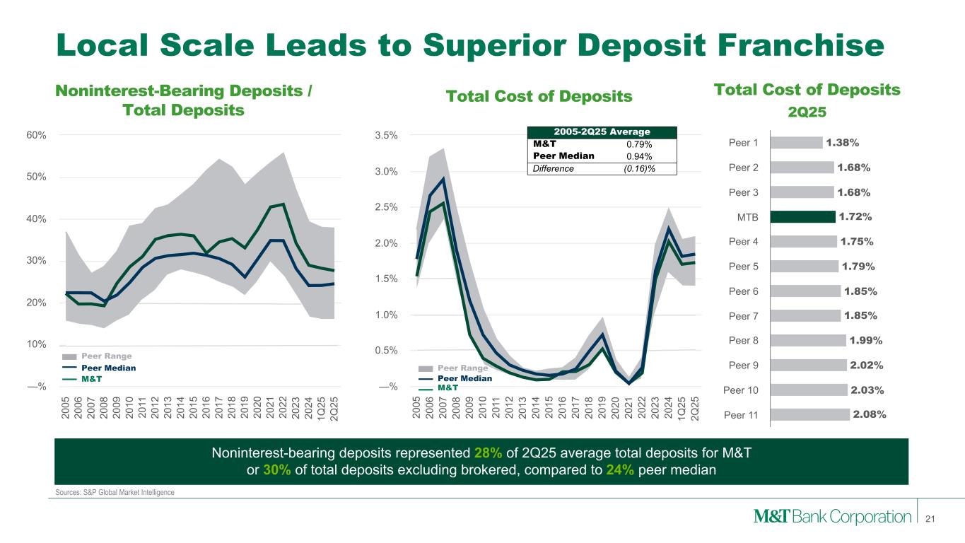 Local Scale in Key Markets 20 Source: S&P Global Market Intelligence, FDIC Summary of Deposits (1) Weighted Average by County (2) Top banks and thrifts by number of branches in Northeast / Mid-Atlantic regions (CT, DC, DE, MA, MD, ME, NH, NJ, NY, PA, RI, VA, VT, WV). M&T as of 6/30/2025, excludes three domestic branches outside of Northeast footprint. Household Income(1) ($,000’s) Peer 1 $89 Peer 2 $89 MTB $86 Peer 3 $85 Peer 4 $84 Peer 5 $81 Peer 6 $80 Peer 7 $77 Peer 8 $77 Peer 9 $75 Peer 10 $72 Peer 11 $72 Top Northeast Banks by Branches(2) Branches JPMorgan Chase & Co. 1,191 Bank of America Corp. 1,029 M&T Bank Corp. 940 Toronto-Dominion Bank 865 Citizens Financial Group 838 Wells Fargo & Co. 797 PNC Financial Services 689 Truist Financial Corp. 613 KeyCorp 411 Banco Santander SA 397 Dense Northeast network covers a geography with only a 300-mile radius but approximately 22% of U.S. population and 25% of GDP Community Banking Approach… …and Dense, Efficient Network Deposit Market Share(1) Peer 1 34 % Peer 2 28 % MTB 26 % Peer 3 24 % Peer 4 23 % Peer 5 18 % Peer 6 16 % Peer 7 16 % Peer 8 14 % Peer 9 14 % Peer 10 12 % Peer 11 8 % …With Market Leading Franchises…