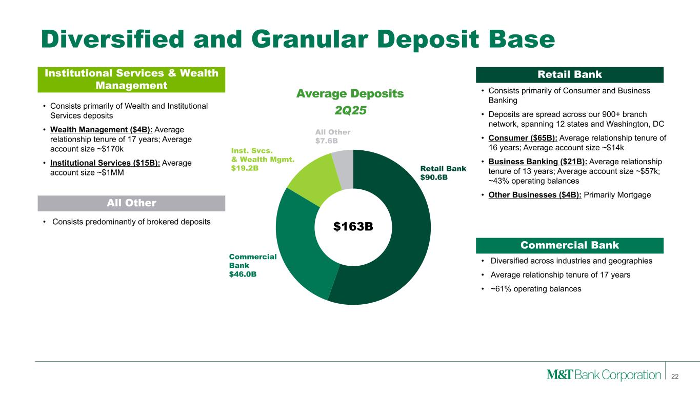 20 05 20 06 20 07 20 08 20 09 20 10 20 11 20 12 20 13 20 14 20 15 20 16 20 17 20 18 20 19 20 20 20 21 20 22 20 23 20 24 1Q 25 2Q 25 —% 0.5% 1.0% 1.5% 2.0% 2.5% 3.0% 3.5% 20 05 20 06 20 07 20 08 20 09 20 10 20 11 20 12 20 13 20 14 20 15 20 16 20 17 20 18 20 19 20 20 20 21 20 22 20 23 20 24 1Q 25 2Q 25 —% 10% 20% 30% 40% 50% 60% Sources: S&P Global Market Intelligence Local Scale Leads to Superior Deposit Franchise Noninterest-bearing deposits represented 28% of 2Q25 average total deposits for M&T or 30% of total deposits excluding brokered, compared to 24% peer median 2005-2Q25 Average M&T 0.79% Peer Median 0.94% Difference (0.16)% Noninterest-Bearing Deposits / Total Deposits Total Cost of Deposits 21 M&T Peer Median Peer Range Total Cost of Deposits 2Q25 M&T Peer Median Peer Range 1.38% 1.68% 1.68% 1.72% 1.75% 1.79% 1.85% 1.85% 1.99% 2.02% 2.03% 2.08% Peer 1 Peer 2 Peer 3 MTB Peer 4 Peer 5 Peer 6 Peer 7 Peer 8 Peer 9 Peer 10 Peer 11
