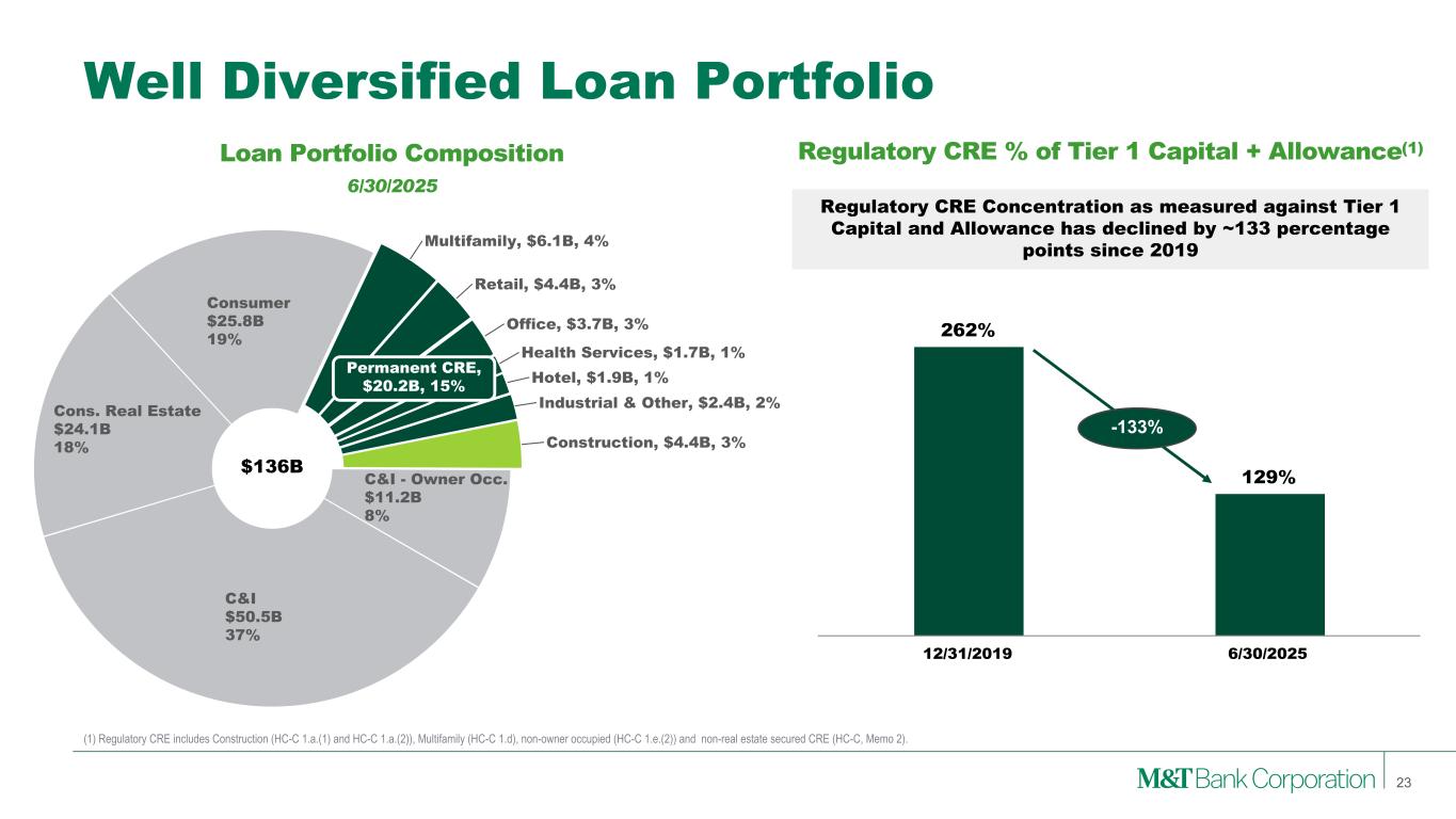 Retail Bank $90.6B Commercial Bank $46.0B Inst. Svcs. & Wealth Mgmt. $19.2B All Other $7.6B Diversified and Granular Deposit Base • Diversified across industries and geographies • Average relationship tenure of 17 years • ~61% operating balances Average Deposits 2Q25 Institutional Services & Wealth Management Retail Bank Commercial Bank • Consists primarily of Consumer and Business Banking • Deposits are spread across our 900+ branch network, spanning 12 states and Washington, DC • Consumer ($65B): Average relationship tenure of 16 years; Average account size ~$14k • Business Banking ($21B): Average relationship tenure of 13 years; Average account size ~$57k; ~43% operating balances • Other Businesses ($4B): Primarily Mortgage • Consists primarily of Wealth and Institutional Services deposits • Wealth Management ($4B): Average relationship tenure of 17 years; Average account size ~$170k • Institutional Services ($15B): Average account size ~$1MM 22 $163B All Other • Consists predominantly of brokered deposits