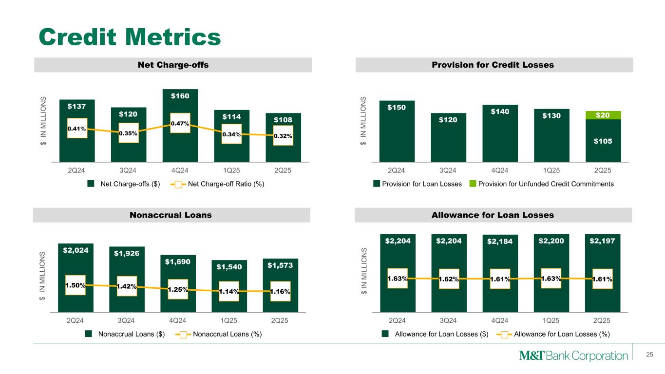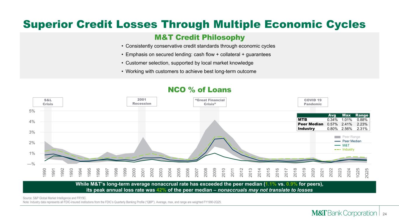 Source: S&P Global Market Intelligence and FRY9C. Note: Industry data represents all FDIC-insured institutions from the FDIC’s Quarterly Banking Profile (“QBP”). Average, max, and range are weighted FY1990-2Q25. Superior Credit Losses Through Multiple Economic Cycles M&T Credit Philosophy NCO % of Loans • Consistently conservative credit standards through economic cycles • Emphasis on secured lending: cash flow + collateral + guarantees • Customer selection, supported by local market knowledge • Working with customers to achieve best long-term outcome “Great Financial Crisis” 2001 Recession S&L Crisis While M&T’s long-term average nonaccrual rate has exceeded the peer median (1.1% vs. 0.9% for peers), its peak annual loss rate was 42% of the peer median – nonaccruals may not translate to losses 24 COVID 19 Pandemic Avg Max Range MTB 0.34% 1.01% 0.88% Peer Median 0.57% 2.41% 2.23% Industry 0.80% 2.56% 2.31% M&T Peer Median Peer Range Industry 19 90 19 91 19 92 19 93 19 94 19 95 19 96 19 97 19 98 19 99 20 00 20 01 20 02 20 03 20 04 20 05 20 06 20 07 20 08 20 09 20 10 20 11 20 12 20 13 20 14 20 15 20 16 20 17 20 18 20 19 20 20 20 21 20 22 20 23 20 24 1Q 25 2Q 25 —% 1% 2% 3% 4% 5%