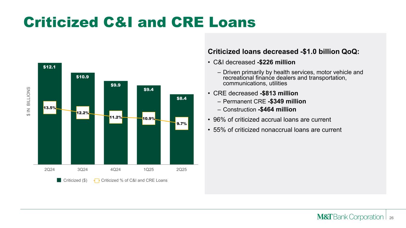 $ IN M IL LI O N S Nonaccrual Loans $2,024 $1,926 $1,690 $1,540 $1,573 1.50% 1.42% 1.25% 1.14% 1.16% Nonaccrual Loans ($) Nonaccrual Loans (%) 2Q24 3Q24 4Q24 1Q25 2Q25 $ IN M IL LI O N S Net Charge-offs $137 $120 $160 $114 $108 0.41% 0.35% 0.47% 0.34% 0.32% Net Charge-offs ($) Net Charge-off Ratio (%) 2Q24 3Q24 4Q24 1Q25 2Q25 $ IN M IL LI O N S Allowance for Loan Losses $2,204 $2,204 $2,184 $2,200 $2,197 1.63% 1.62% 1.61% 1.63% 1.61% Allowance for Loan Losses ($) Allowance for Loan Losses (%) 2Q24 3Q24 4Q24 1Q25 2Q25 $ IN M IL LI O N S Provision for Credit Losses $150 $120 $140 $130 $105 $20 Provision for Loan Losses Provision for Unfunded Credit Commitments 2Q24 3Q24 4Q24 1Q25 2Q25 Credit Metrics 25