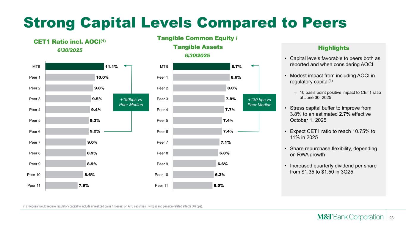 Agency MBS $17.2B US Treasury $8.3B Agency CMBS $6.8B Municipal Bonds $2.2B Equity & Other $1.0B High Quality Securities Portfolio (1) Mortgage securities include estimated prepayment under market forward interest rates. (2) 2Q25 reported yield is 3.81%. See Appendix 1 for reconciliation of this adjusted measure Securities Portfolio Composition 6/30/2025 • Securities of $35.6B; 17% of total assets • ~$2.7B securities maturing(1) in remainder of 2025 with an average yield of 3.6% • Adjusted investment securities yield increased 3 bps QoQ to 4.03% in 2Q25(2) • AFS and pension-related AOCI would have impacted the CET1 capital ratio by +10 bps at the end of 2Q25 • HTM debt securities represent 37% of securities at 6/30/2025 • Agency MBS/CMBS and U.S. Treasurys represent ~91% of securities portfolio Duration Pretax Unrealized Gain/(Loss) AFS ~2.6 years $82 million HTM ~5.3 years $(953) million Total Debt Securities ~3.6 years $(871) million Highlights 27 $36B