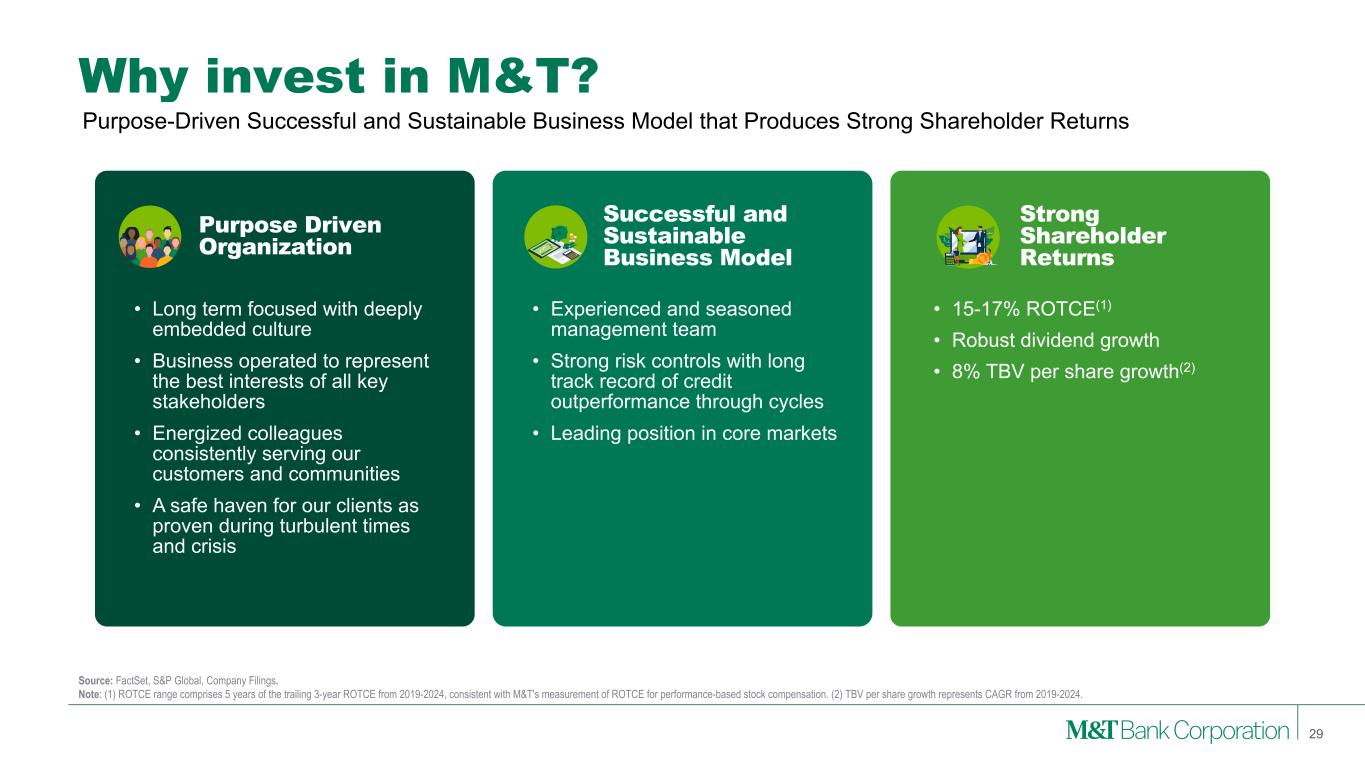 Strong Capital Levels Compared to Peers • Capital levels favorable to peers both as reported and when considering AOCI • Modest impact from including AOCI in regulatory capital(1) – 10 basis point positive impact to CET1 ratio at June 30, 2025 • Stress capital buffer to improve from 3.8% to an estimated 2.7% effective October 1, 2025 • Expect CET1 ratio to reach 10.75% to 11% in 2025 • Share repurchase flexibility, depending on RWA growth • Increased quarterly dividend per share from $1.35 to $1.50 in 3Q25 (1) Proposal would require regulatory capital to include unrealized gains / (losses) on AFS securities (+4 bps) and pension-related effects (+6 bps). CET1 Ratio incl. AOCI(1) 6/30/2025 Tangible Common Equity / Tangible Assets 6/30/2025 Highlights 28 11.1% 10.0% 9.8% 9.5% 9.4% 9.3% 9.2% 9.0% 8.9% 8.9% 8.6% 7.9% MTB Peer 1 Peer 2 Peer 3 Peer 4 Peer 5 Peer 6 Peer 7 Peer 8 Peer 9 Peer 10 Peer 11 8.7% 8.6% 8.0% 7.8% 7.7% 7.4% 7.4% 7.1% 6.8% 6.6% 6.2% 6.0% MTB Peer 1 Peer 2 Peer 3 Peer 4 Peer 5 Peer 6 Peer 7 Peer 8 Peer 9 Peer 10 Peer 11 +130 bps vs Peer Median +190bps vs Peer Median