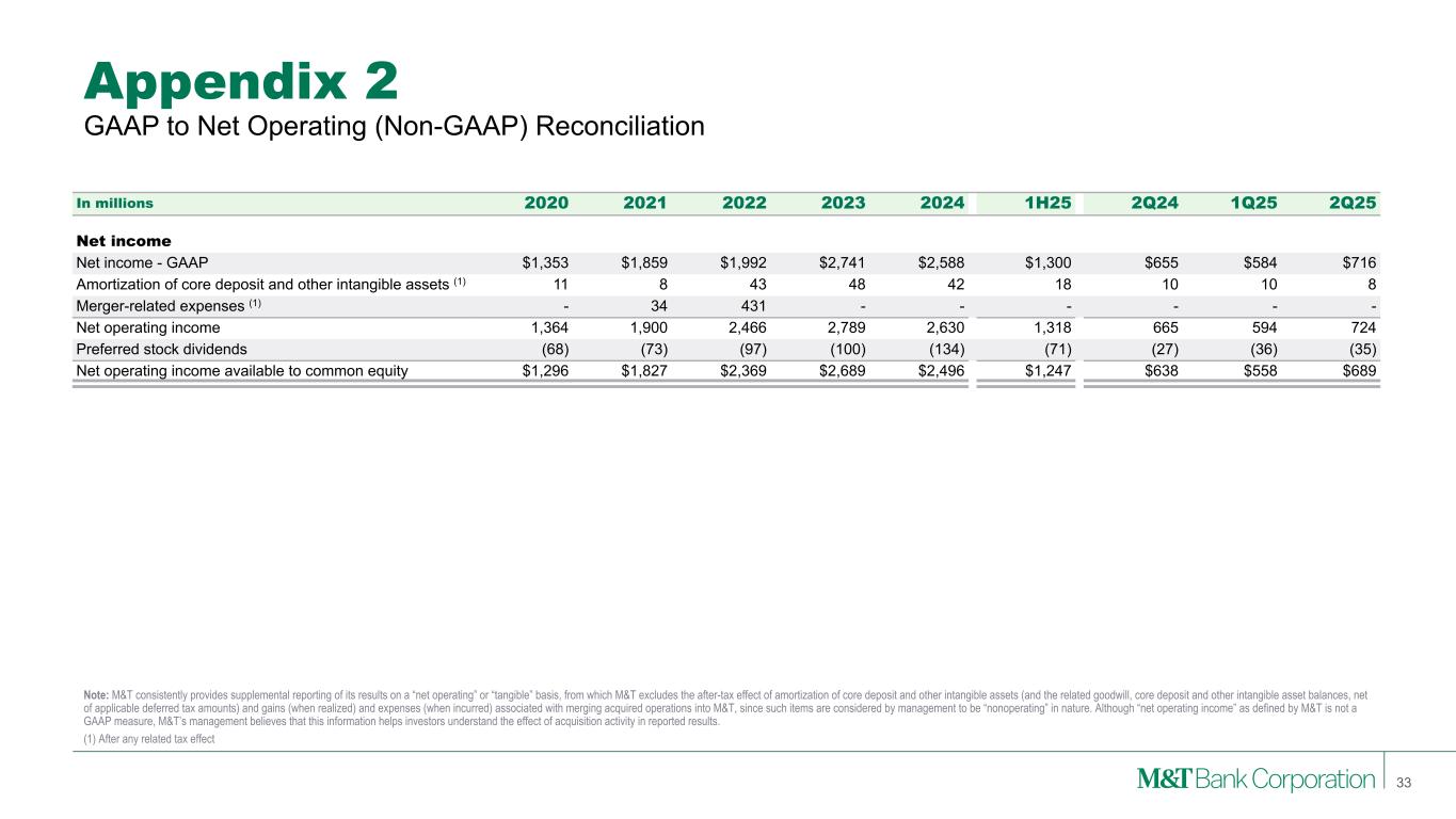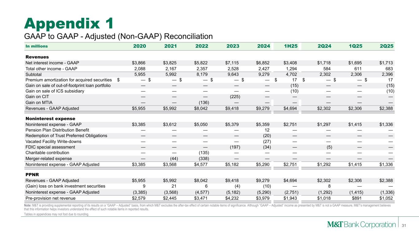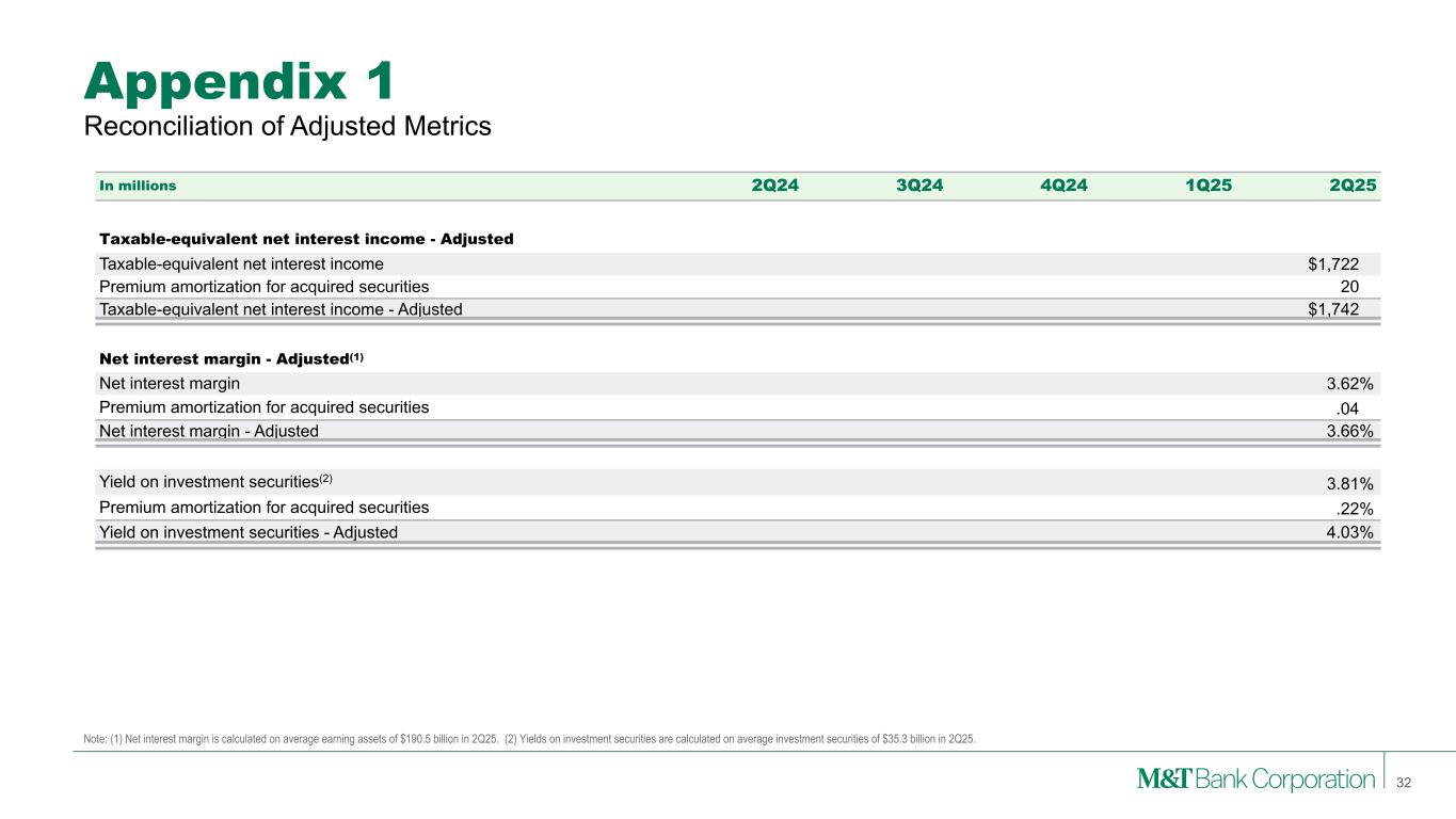 Appendix 1 Note: M&T is providing supplemental reporting of its results on a “GAAP – Adjusted” basis, from which M&T excludes the after-tax effect of certain notable items of significance. Although “GAAP – Adjusted” income as presented by M&T is not a GAAP measure, M&T’s management believes that this information helps investors understand the effect of such notable items in reported results. Tables in appendices may not foot due to rounding. GAAP to GAAP - Adjusted (Non-GAAP) Reconciliation 31 In millions 2020 2021 2022 2023 2024 1H25 2Q24 1Q25 2Q25 Revenues Net interest income - GAAP $3,866 $3,825 $5,822 $7,115 $6,852 $3,408 $1,718 $1,695 $1,713 Total other income - GAAP 2,088 2,167 2,357 2,528 2,427 1,294 584 611 683 Subtotal 5,955 5,992 8,179 9,643 9,279 4,702 2,302 2,306 2,396 Premium amortization for acquired securities $ — $ — $ — $ — $ — $ 17 $ — $ — $ 17 Gain on sale of out-of-footprint loan portfolio — — — — — (15) — — (15) Gain on sale of ICS subsidiary — — — — — (10) — — (10) Gain on CIT — — — (225) — — — — — Gain on MTIA — — (136) — — — — — — Revenues - GAAP Adjusted $5,955 $5,992 $8,042 $9,418 $9,279 $4,694 $2,302 $2,306 $2,388 Noninterest expense Noninterest expense - GAAP $3,385 $3,612 $5,050 $5,379 $5,359 $2,751 $1,297 $1,415 $1,336 Pension Plan Distribution Benefit — — — — 12 — — — — Redemption of Trust Preferred Obligations — — — — (20) — — — — Vacated Facility Write-downs — — — — (27) — — — — FDIC special assessment — — — (197) (34) — (5) — — Charitable contribution — — (135) — — — — — — Merger-related expense — (44) (338) — — — — — — Noninterest expense - GAAP Adjusted $3,385 $3,568 $4,577 $5,182 $5,290 $2,751 $1,292 $1,415 $1,336 PPNR Revenues - GAAP Adjusted $5,955 $5,992 $8,042 $9,418 $9,279 $4,694 $2,302 $2,306 $2,388 (Gain) loss on bank investment securities 9 21 6 (4) (10) — 8 — — Noninterest expense - GAAP Adjusted (3,385) (3,568) (4,577) (5,182) (5,290) (2,751) (1,292) (1,415) (1,336) Pre-provision net revenue $2,579 $2,445 $3,471 $4,232 $3,979 $1,943 $1,018 $891 $1,052