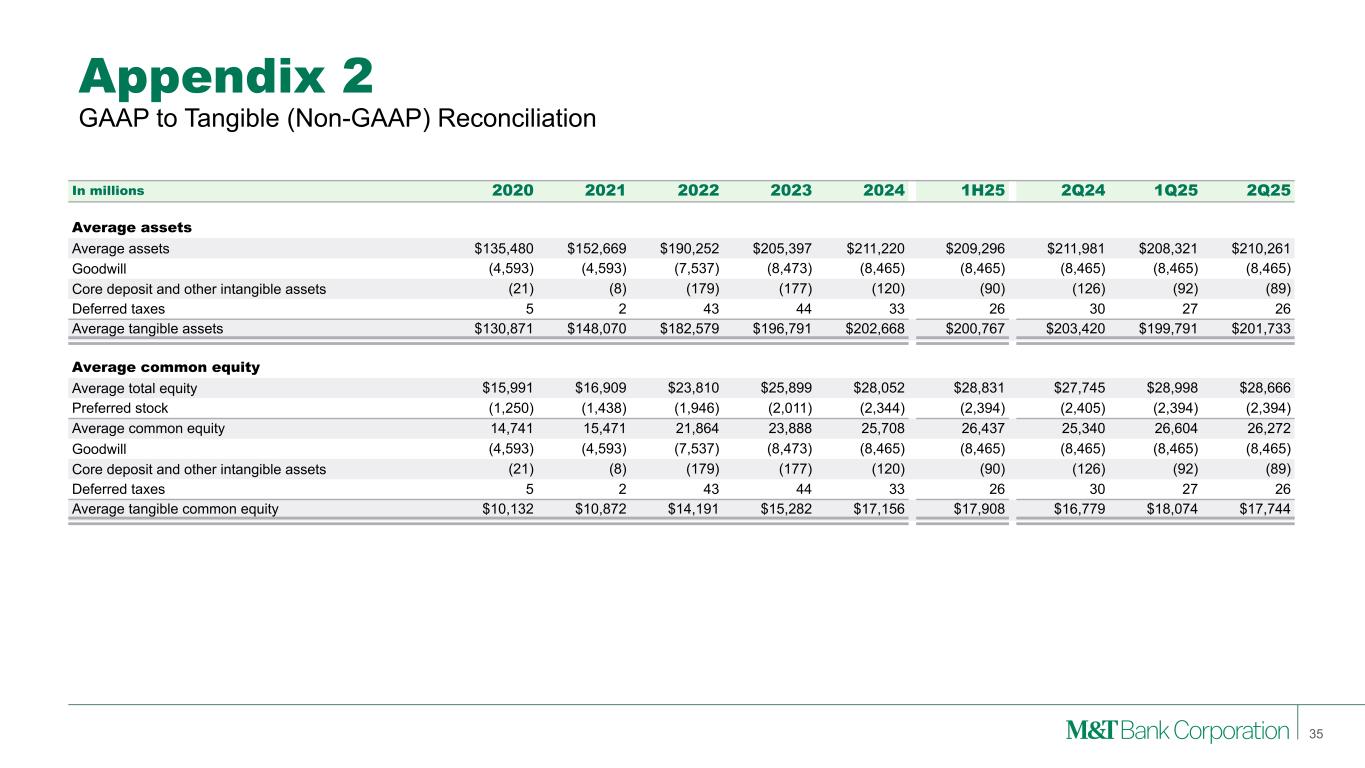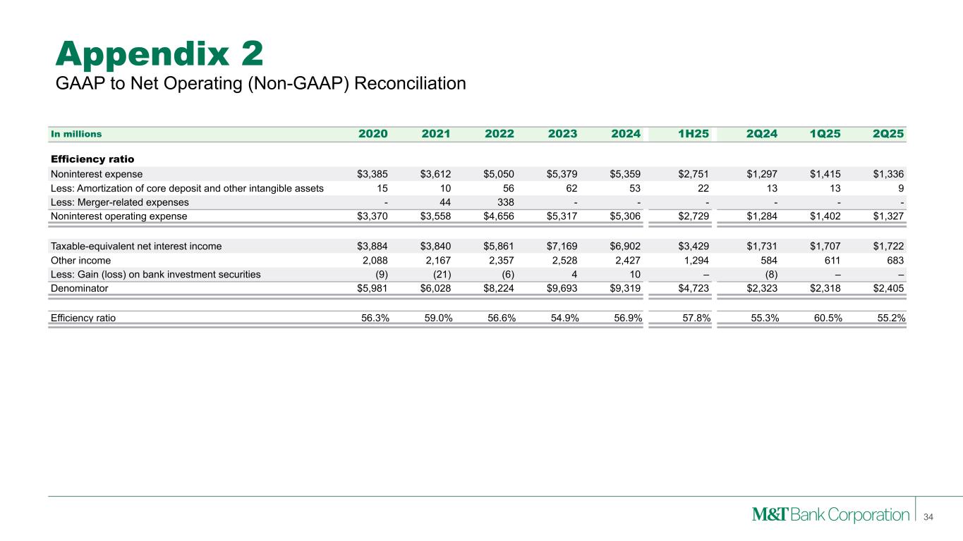 Appendix 2 Note: M&T consistently provides supplemental reporting of its results on a “net operating” or “tangible” basis, from which M&T excludes the after-tax effect of amortization of core deposit and other intangible assets (and the related goodwill, core deposit and other intangible asset balances, net of applicable deferred tax amounts) and gains (when realized) and expenses (when incurred) associated with merging acquired operations into M&T, since such items are considered by management to be “nonoperating” in nature. Although “net operating income” as defined by M&T is not a GAAP measure, M&T’s management believes that this information helps investors understand the effect of acquisition activity in reported results. (1) After any related tax effect 33 GAAP to Net Operating (Non-GAAP) Reconciliation In millions 2020 2021 2022 2023 2024 1H25 2Q24 1Q25 2Q25 Net income Net income - GAAP $1,353 $1,859 $1,992 $2,741 $2,588 $1,300 $655 $584 $716 Amortization of core deposit and other intangible assets (1) 11 8 43 48 42 18 10 10 8 Merger-related expenses (1) - 34 431 - - - - - - Net operating income 1,364 1,900 2,466 2,789 2,630 1,318 665 594 724 Preferred stock dividends (68) (73) (97) (100) (134) (71) (27) (36) (35) Net operating income available to common equity $1,296 $1,827 $2,369 $2,689 $2,496 $1,247 $638 $558 $689
