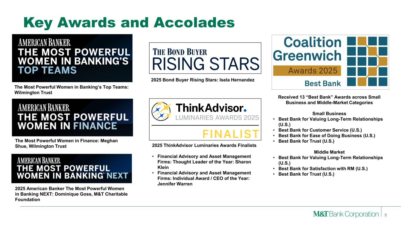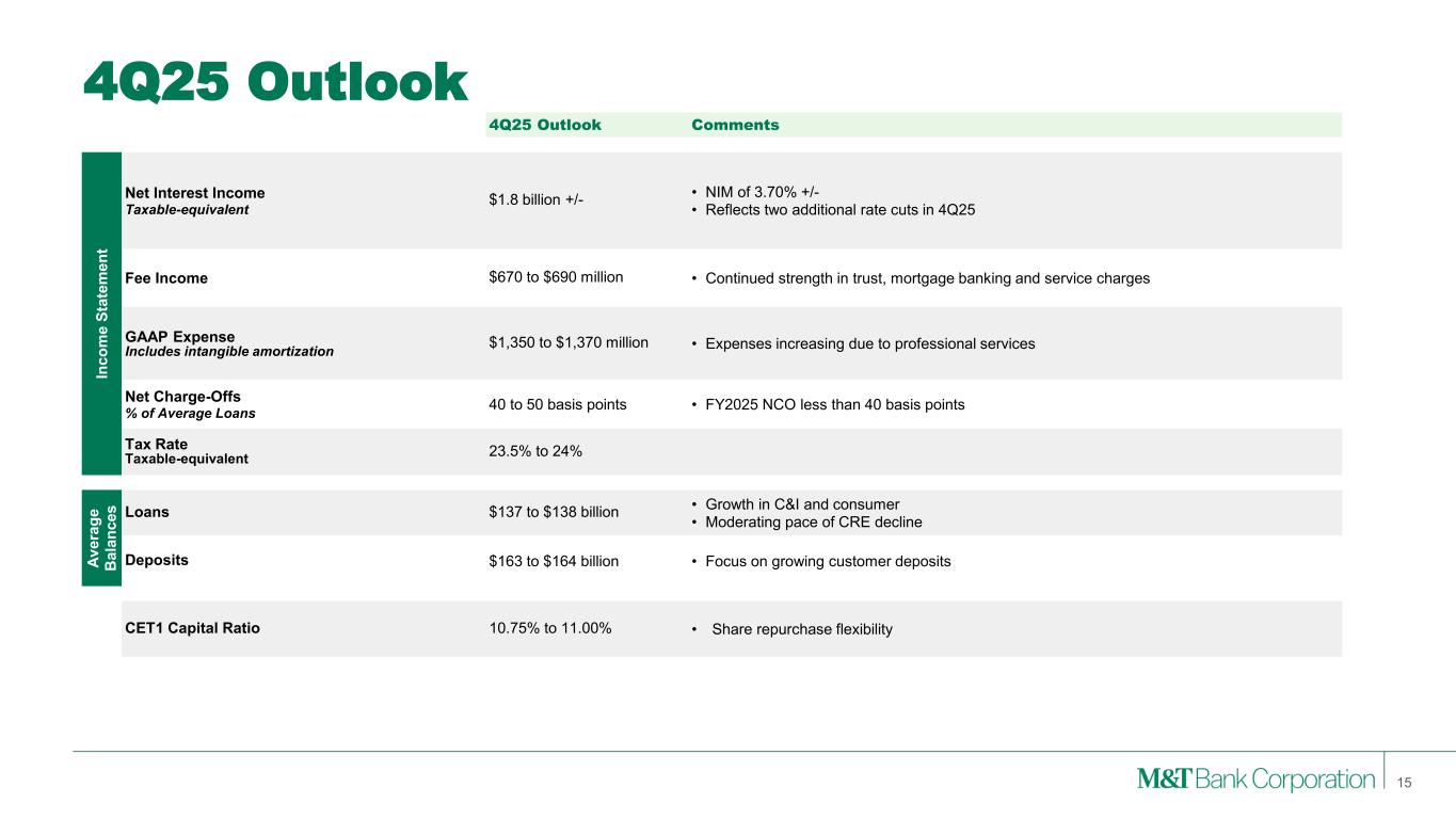 Forward-Looking Statements and Non-GAAP Financial Measures This presentation may contain forward-looking statements regarding M&T Bank Corporation (“M&T”) within the meaning of the Private Securities Litigation Reform Act of 1995 and the rules and regulations of the Securities and Exchange Commission (“SEC”). Any statement that does not describe historical or current facts is a forward-looking statement, including statements based on current expectations, estimates and projections about M&T's business, and management's beliefs and assumptions. Statements regarding the potential effects of events or factors specific to M&T and/or the financial industry as a whole, as well as national and global events generally, on M&T's business, financial condition, liquidity and results of operations may constitute forward-looking statements. Such statements are subject to the risk that the actual effects may differ, possibly materially, from what is reflected in those forward-looking statements due to factors and future developments that are uncertain, unpredictable and in many cases beyond M&T's control. Forward-looking statements are typically identified by words such as "believe," "expect," "anticipate," "intend," "target," "estimate," "continue," or "potential," by future conditional verbs such as "will," "would," "should," "could," or "may," or by variations of such words or by similar expressions. These statements are not guarantees of future performance and involve certain risks, uncertainties and assumptions which are difficult to predict and may cause actual outcomes to differ materially from what is expressed or forecasted. While there can be no assurance that any list of risks and uncertainties is complete, important factors that could cause actual outcomes and results to differ materially from those contemplated by forward-looking statements include the following, without limitation: economic conditions and growth rates, including inflation and market volatility; events, developments and current conditions in the financial services industry, including trust, brokerage and investment management businesses; changes in interest rates, spreads on earning assets and interest-bearing liabilities, and interest rate sensitivity; prepayment speeds, loan originations, loan concentrations by type and industry, credit losses and market values on loans, collateral securing loans, and other assets; sources of liquidity; levels of client deposits; ability to contain costs and expenses; changes in M&T's credit ratings; domestic or international political developments and other geopolitical events, including trade and tariff policies and international conflicts and hostilities; changes and trends in the securities markets; common shares outstanding and common stock price volatility; fair value of and number of stock-based compensation awards to be issued in future periods; the impact of changes in market values on trust-, brokerage-, and investment management-related revenues; federal, state or local legislation and/or regulations affecting the financial services industry, or M&T and its subsidiaries individually or collectively, including tax policy; regulatory supervision and oversight, including monetary policy and capital requirements; governmental and public policy changes; political conditions, either nationally or in the states in which M&T and its subsidiaries do business; the initiation and outcome of potential, pending and future litigation, investigations and governmental proceedings, including tax-related examinations and other matters; operational risk events, including loss resulting from fraud by employees or persons outside M&T and breaches in data and cybersecurity; changes in accounting policies or procedures as may be required by the Financial Accounting Standards Board, regulatory agencies or legislation; increasing price, product and service competition by competitors, including new entrants; technological developments and changes; the ability to continue to introduce competitive new products and services on a timely, cost-effective basis; the mix of products and services; protection and validity of intellectual property rights; reliance on large customers; technological, implementation and cost/financial risks in large, multi-year contracts; continued availability of financing; financial resources in the amounts, at the times and on the terms required to support M&T and its subsidiaries' future businesses; and material differences in the actual financial results of merger, acquisition, divestment and investment activities compared with M&T's initial expectations, including the full realization of anticipated cost savings and revenue enhancements. These are representative of the factors that could affect the outcome of the forward-looking statements. In addition, as noted, such statements could be affected by general industry and market conditions and growth rates, general economic and political conditions, either nationally or in the states in which M&T and its subsidiaries do business, and other factors. M&T provides further detail regarding these risks and uncertainties in its Form 10-K for the year ended December 31, 2024, including in the Risk Factors section of such report, as well as in other SEC filings. Forward-looking statements speak only as of the date they are made, and M&T assumes no duty and does not undertake to update forward-looking statements. Annualized, pro forma, projected, and estimated numbers are used for illustrative purposes only, are not forecasts and may not reflect actual results. This presentation also contains financial information and performance measures determined by methods other than in accordance with accounting principles generally accepted in the United States ("GAAP"). Management believes investors may find these non-GAAP financial measures useful. These disclosures should not be viewed as a substitute for financial measures determined i