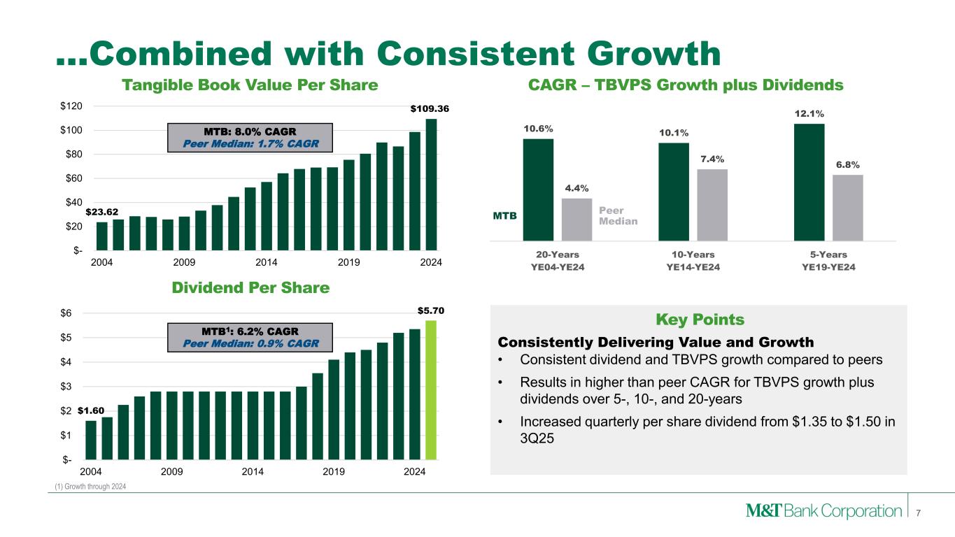 Through the Cycle Profitability Advantage… 6 (1) See Appendix 1 and 2 for reconciliation of GAAP with these non-GAAP measures Net Operating ROTA(1) Better than Peer PPNR Generation & Credit Losses • Aided by NIM, efficiency and credit loss outperformance Consistent Profitability Advantage • Over the past 5-, 10-, and 20-years, M&T maintained an 18 to 30 basis point ROTA advantage compared to the peer median Results in Normalized ROTCE Advantage • Equates to a ~2.4% to ~3.9% normalized ROTCE advantage compared to peers assuming normalized capital levels ROTA Considered in Long-Term Incentives • Recent Performance Vested Stock Units grants include a 1.25% absolute ROTA threshold +30bps +18bps +18bps Key Points MTB Peer Median 1.31% 1.34% 1.28% 1.01% 1.15% 1.10% 20-Years 2005-2024 10-Years 2015-2024 5-Years 2020-2024