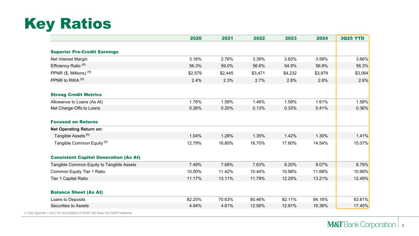 $1.60 $5.70 $- $1 $2 $3 $4 $5 $6 2004 2009 2014 2019 2024 $23.62 $109.36 $- $20 $40 $60 $80 $100 $120 2004 2009 2014 2019 2024 …Combined with Consistent Growth Dividend Per Share Tangible Book Value Per Share MTB1: 6.2% CAGR Peer Median: 0.9% CAGR MTB: 8.0% CAGR Peer Median: 1.7% CAGR CAGR – TBVPS Growth plus Dividends MTB Peer Median Consistently Delivering Value and Growth • Consistent dividend and TBVPS growth compared to peers • Results in higher than peer CAGR for TBVPS growth plus dividends over 5-, 10-, and 20-years • Increased quarterly per share dividend from $1.35 to $1.50 in 3Q25 Key Points 7 10.6% 10.1% 12.1% 4.4% 7.4% 6.8% 20-Years YE04-YE24 10-Years YE14-YE24 5-Years YE19-YE24 (1) Growth through 2024