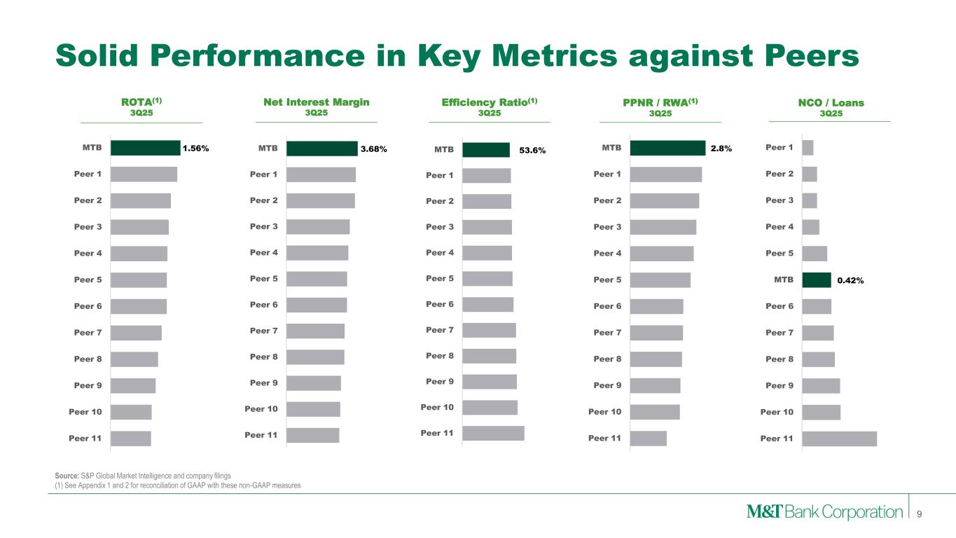 2020 2021 2022 2023 2024 3Q25 YTD Superior Pre-Credit Earnings Net Interest Margin 3.16% 2.76% 3.39% 3.83% 3.58% 3.66% Efficiency Ratio (1) 56.3% 59.0% 56.6% 54.9% 56.9% 56.3% PPNR ($, Millions) (1) $2,579 $2,445 $3,471 $4,232 $3,979 $3,064 PPNR to RWA (1) 2.4% 2.3% 2.7% 2.8% 2.6% 2.6% Strong Credit Metrics Allowance to Loans (As At) 1.76% 1.58% 1.46% 1.59% 1.61% 1.58% Net Charge-Offs to Loans 0.26% 0.20% 0.13% 0.33% 0.41% 0.36% Focused on Returns Net Operating Return on: Tangible Assets (1) 1.04% 1.28% 1.35% 1.42% 1.30% 1.41% Tangible Common Equity (1) 12.79% 16.80% 16.70% 17.60% 14.54% 15.07% Consistent Capital Generation (As At) Tangible Common Equity to Tangible Assets 7.49% 7.68% 7.63% 8.20% 9.07% 8.79% Common Equity Tier 1 Ratio 10.00% 11.42% 10.44% 10.98% 11.68% 10.99% Tier 1 Capital Ratio 11.17% 13.11% 11.79% 12.29% 13.21% 12.49% Balance Sheet (As At) Loans to Deposits 82.25% 70.63% 80.46% 82.11% 84.16% 83.81% Securities to Assets 4.94% 4.61% 12.56% 12.91% 16.36% 17.45% Key Ratios 8 (1) See Appendix 1 and 2 for reconciliation of GAAP with these non-GAAP measures