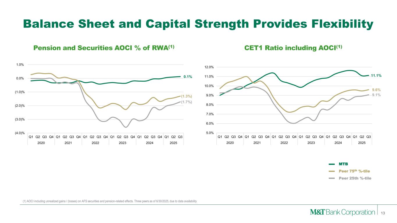 Consistent Growth 12 Profitability outperformance also combined with consistent and strong Dividend and TBVPS growth Cumulative Dividend Per Share Growth Cumulative TBVPS Growth 36% 40% 6% 0% 10% 20% 30% 40% Q1 Q2 Q3 Q4 Q1 Q2 Q3 Q4 Q1 Q2 Q3 Q4 Q1 Q2 Q3 Q4 Q1 Q2 Q3 Q4 Q1 Q2 Q3 2020 2021 2022 2023 2024 2025 48.6% 5.3% 20.8% (40.0)% (30.0)% (20.0)% (10.0)% 0.0% 10.0% 20.0% 30.0% 40.0% 50.0% Q1 Q2 Q3 Q4 Q1 Q2 Q3 Q4 Q1 Q2 Q3 Q4 Q1 Q2 Q3 Q4 Q1 Q2 Q3 Q4 Q1 Q2 Q3 2020 2021 2022 2023 2024 2025 Company Cumulative TBVPS Growth MTB 48.6% Peer 1 40.0% Peer 2 27.1% Peer 3 26.8% Peer 4 16.3% Peer 5 16.1% Peer 6 15.2% Peer 7 14.8% Peer 8 7.5% Peer 9 3.1% Peer 10 3.1% Peer 11 (1.6%) Median (excl. MTB) 15.2% Company Cumulative Div Growth Peer 1 71.0% Peer 2 48.1% Peer 3 47.8% MTB 36.4% Peer 4 32.4% Peer 5 23.8% Peer 6 15.6% Peer 7 10.8% Peer 8 7.7% Peer 9 4.4% Peer 10 3.3% Peer 11 0.0% Median (excl. MTB) 15.6% MTB Peer 75th %-tile Peer 25th %-tile