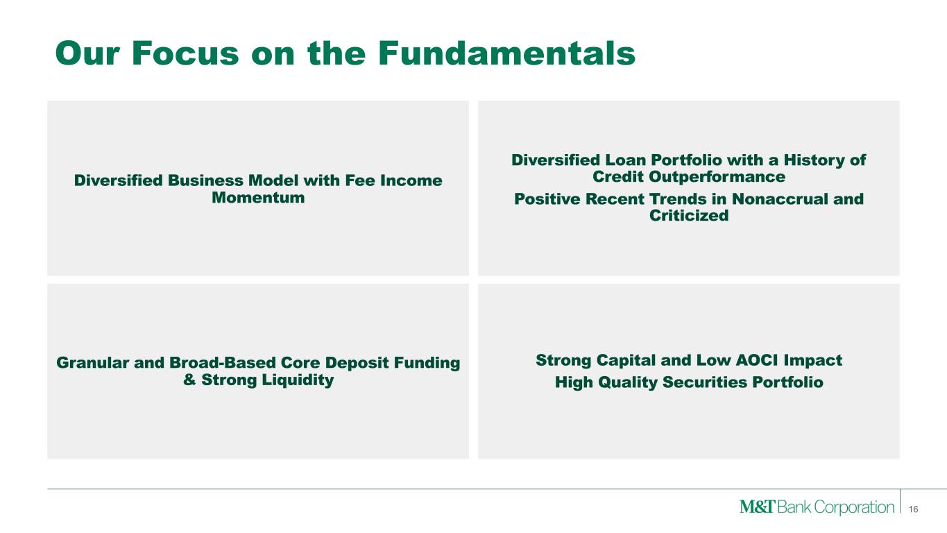 4Q25 Outlook 15 4Q25 Outlook Comments In c o m e S ta te m e n t Net Interest Income Taxable-equivalent $1.8 billion +/- • NIM of 3.70% +/- • Reflects two additional rate cuts in 4Q25 Fee Income $670 to $690 million • Continued strength in trust, mortgage banking and service charges GAAP Expense Includes intangible amortization $1,350 to $1,370 million • Expenses increasing due to professional services Net Charge-Offs % of Average Loans 40 to 50 basis points • FY2025 NCO less than 40 basis points Tax Rate Taxable-equivalent 23.5% to 24% A v e ra g e B a la n c e s Loans $137 to $138 billion • Growth in C&I and consumer • Moderating pace of CRE decline Deposits $163 to $164 billion • Focus on growing customer deposits CET1 Capital Ratio 10.75% to 11.00% • Share repurchase flexibility