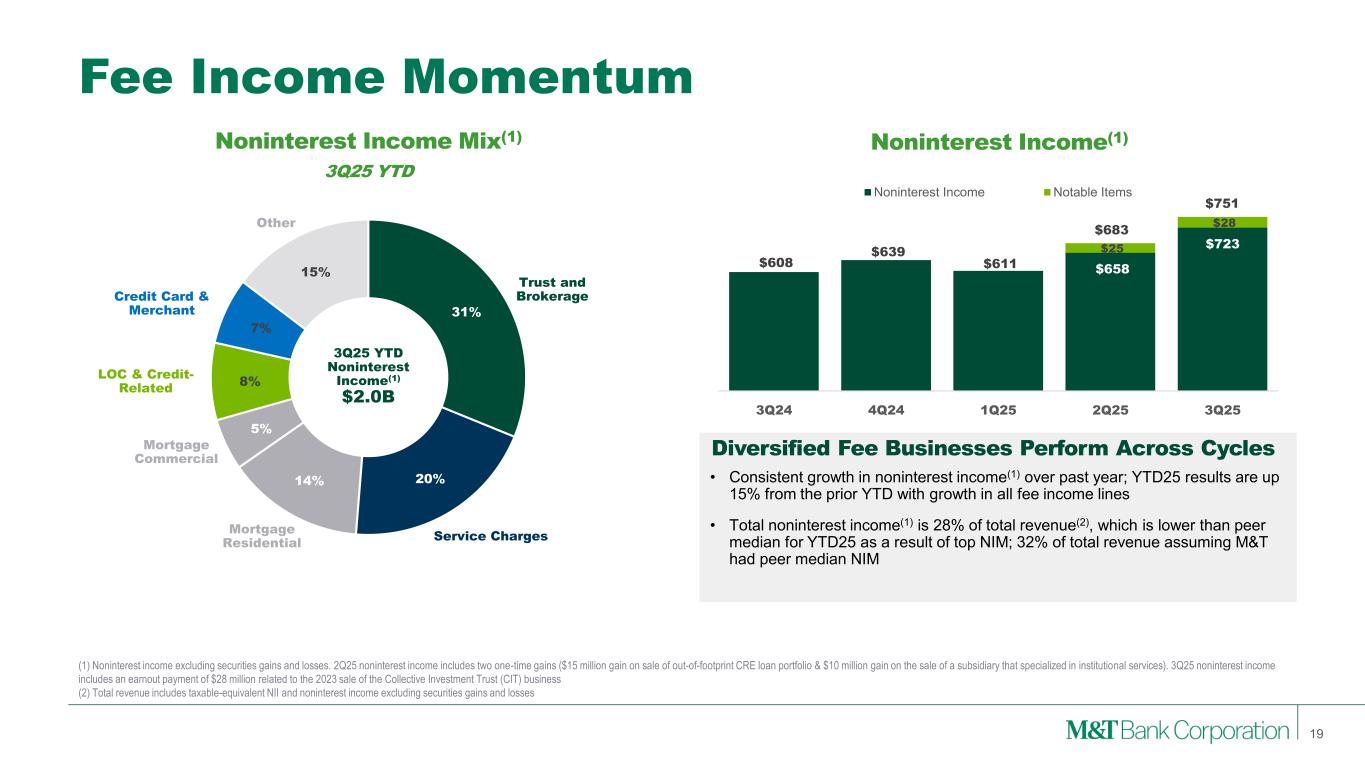 Diversified Business Model Experienced teams provide a wide-range of credit, liquidity and capital markets solutions to meet our customer needs, delivered through a local engagement model and industry expertise on a national scale. Strategically built for the communities in which we operate. High-touch, local sales and service model provides a low-cost, stable funding base, a long-tenured customer base, and the shared benefits of community growth and development. 17 Institutional Services Expanding on strength of its reputation for industry leading service and strong reputation with existing network of deal influencers. Wealth Management Provides planning-led advice, leveraging Wilmington Trust’s national capabilities and the enhanced experience that LPL brings, to grow customers across the wealth continuum. Note: ‘All Other’ category not shown above. Represents 3% ($144 million) of NII, 4% ($90 million) of fees, 3% ($234 million) of revenue, <0.25% (<$0.25 billion) of loans and 5% ($8 billion) of deposits. (1) Net interest income is the difference between actual taxable-equivalent interest earned on assets and interest paid on liabilities by a segment and a funding charge (credit) based on the Company’s internal funds transfer pricing methodology (2) See Appendix 1 and 2 for reconciliation of GAAP with these non-GAAP measures Commercial Bank Retail Bank Institutional Services & Wealth Management Net Interest Income1 $1,599 million 31% $2,959 million 57% $500 million 10% $5,202 million Fee Income $587 million 29% $691 million 34% $678 million 33% $2,046 million Revenue $2,186 million 30% $3,650 million 50% $1,178 million 16% $7,248 million Average Loans $78 billion 57% $53 billion 39% $4 billion 3% $136 billion Average Deposits $46 billion 28% $90 billion 55% $19 billion 12% $162 billion ROTA2 1.17% 2.61% 12.30% 1.41% ROTCE2 13.2% 31.0% 81.4% 15.1% Efficiency Ratio2 49.4% 53.7% 55.1% 56.3% 3Q25 YTD, % of Total M&T Total M&T