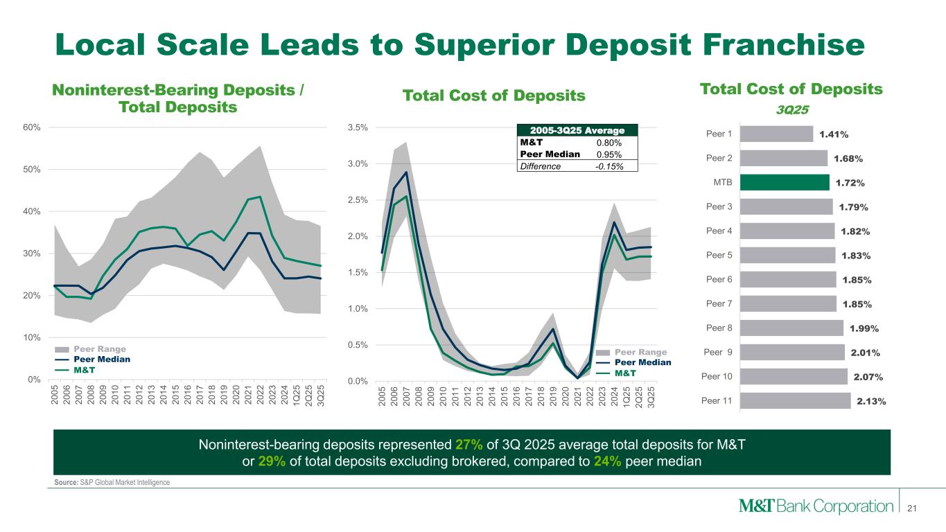 Local Scale in Key Markets 20 Source: S&P Global Market Intelligence, FDIC Summary of Deposits (1) Weighted Average by County (2) Top banks and thrifts by number of branches in Northeast / Mid-Atlantic regions (CT, DC, DE, MA, MD, ME, NH, NJ, NY, PA, RI, VA, VT, WV). M&T as of 10/20/2025, excludes three domestic branches outside of Northeast footprint Top Northeast Banks by Branches1 Branches 1 JPMorgan Chase & Co. 1,214 2 Bank of America Corp. 1,030 3 M&T Bank Corp. 939 4 Toronto-Dominion Bank 866 5 Citizens Financial Group 834 6 Wells Fargo & Co. 788 7 PNC Financial Services 684 8 Truist Financial Corp. 613 9 KeyCorp 409 10 Banco Santander SA​ 379 Dense Northeast network covers a geography with only a 300-mile radius but approximately 22% of U.S. population and 25% of GDP Community Banking Approach… …With Market Leading Franchises… …and Dense, Efficient Network Household Income(1) ($,000’s) Peer 1 $90 Peer 2 $89 MTB $86 Peer 3 $85 Peer 4 $85 Peer 5 $83 Peer 6 $82 Peer 7 $79 Peer 8 $77 Peer 9 $75 Peer 10 $72 Peer 11 $72 Deposit Market Share(1) Peer 1 33% Peer 2 27% MTB 25% Peer 3 24% Peer 4 22% Peer 5 18% Peer 6 17% Peer 7 14% Peer 8 14% Peer 9 13% Peer 10 12% Peer 11 8%