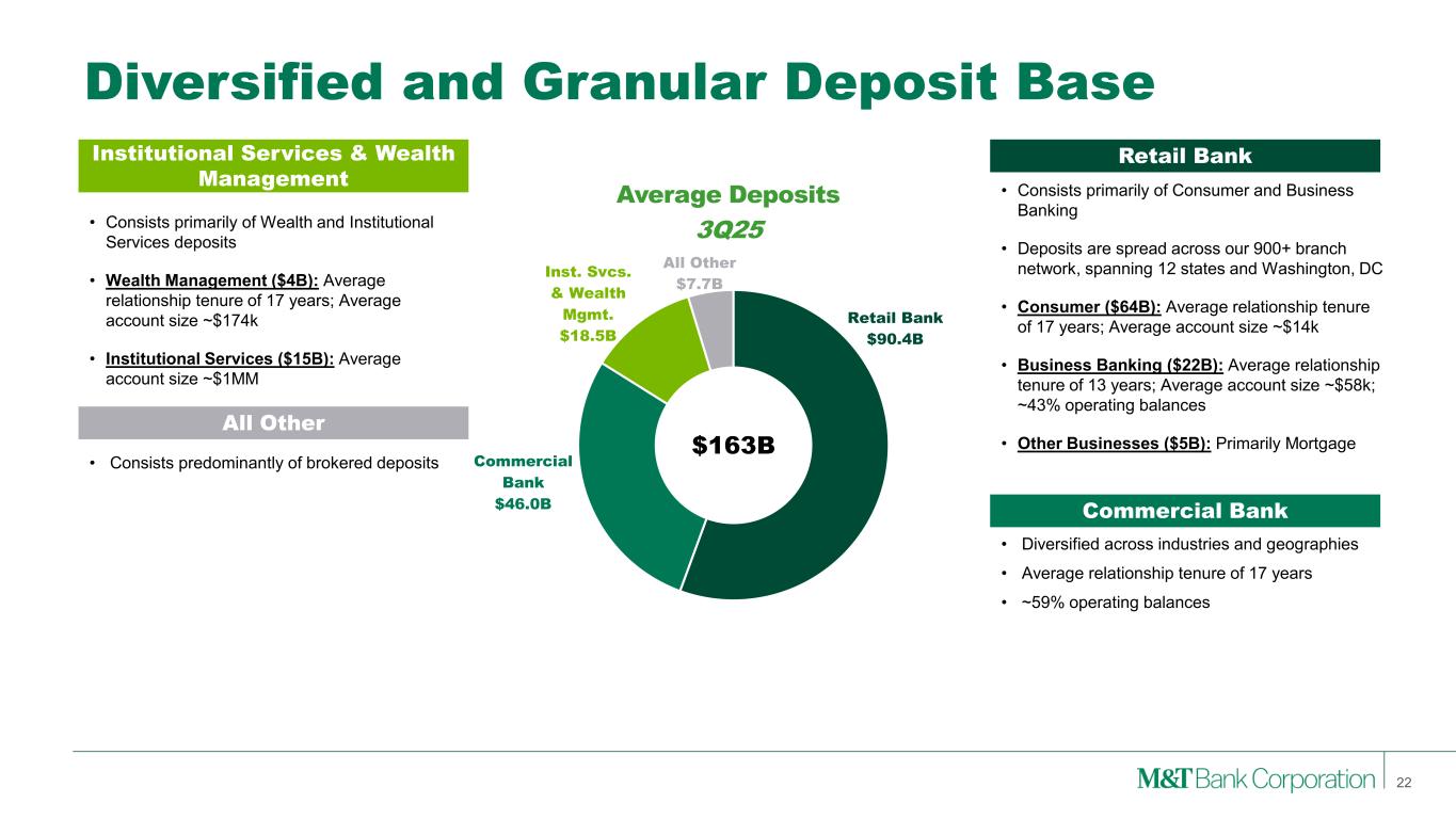 0% 10% 20% 30% 40% 50% 60% 2 0 0 5 2 0 0 6 2 0 0 7 2 0 0 8 2 0 0 9 2 0 1 0 2 0 1 1 2 0 1 2 2 0 1 3 2 0 1 4 2 0 1 5 2 0 1 6 2 0 1 7 2 0 1 8 2 0 1 9 2 0 2 0 2 0 2 1 2 0 2 2 2 0 2 3 2 0 2 4 1 Q 2 5 2 Q 2 5 3 Q 2 5 0.0% 0.5% 1.0% 1.5% 2.0% 2.5% 3.0% 3.5% 2 0 0 5 2 0 0 6 2 0 0 7 2 0 0 8 2 0 0 9 2 0 1 0 2 0 1 1 2 0 1 2 2 0 1 3 2 0 1 4 2 0 1 5 2 0 1 6 2 0 1 7 2 0 1 8 2 0 1 9 2 0 2 0 2 0 2 1 2 0 2 2 2 0 2 3 2 0 2 4 1 Q 2 5 2 Q 2 5 3 Q 2 5 Source: S&P Global Market Intelligence Local Scale Leads to Superior Deposit Franchise Noninterest-bearing deposits represented 27% of 3Q 2025 average total deposits for M&T or 29% of total deposits excluding brokered, compared to 24% peer median 2005-3Q25 Average M&T 0.80% Peer Median 0.95% Difference -0.15% Noninterest-Bearing Deposits / Total Deposits Total Cost of Deposits 21 M&T Peer Median Peer Range Total Cost of Deposits 3Q25 M&T Peer Median Peer Range 1.41% 1.68% 1.72% 1.79% 1.82% 1.83% 1.85% 1.85% 1.99% 2.01% 2.07% 2.13% Peer 1 Peer 2 MTB Peer 3 Peer 4 Peer 5 Peer 6 Peer 7 Peer 8 Peer 9 Peer 10 Peer 11