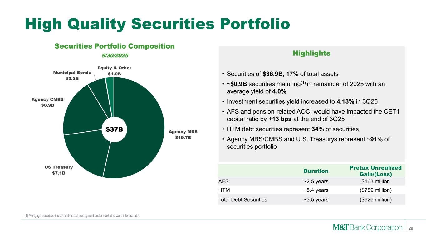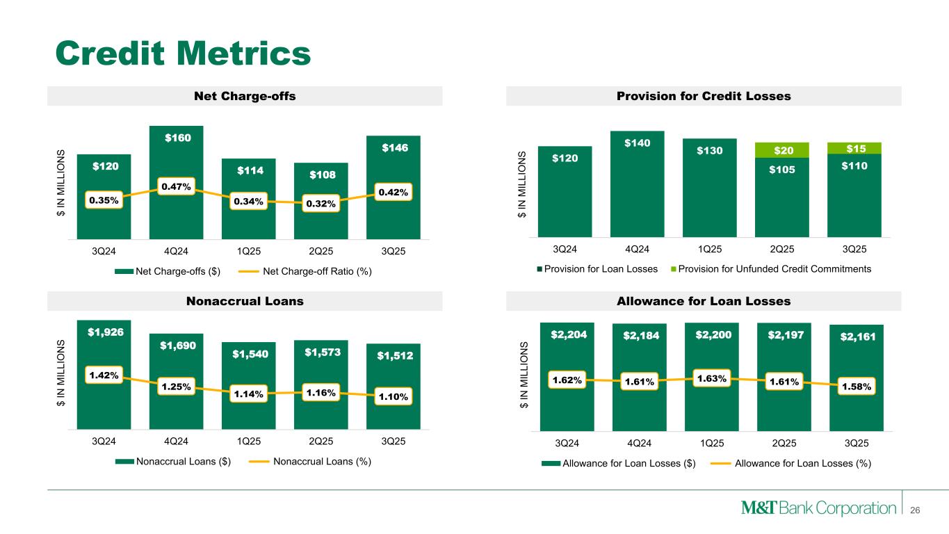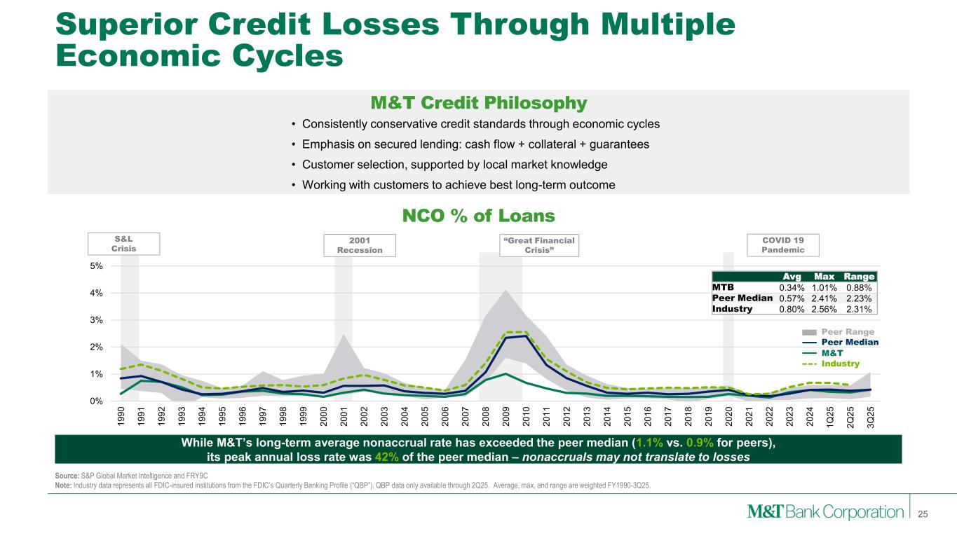 Loans to Nondepository Financial Institutions 24 Note: Loans to NDFIs presented above are estimates pending the filing of M&T Bank’s Call Report. (1) Peer median as of 6/30/2025 due to data availability Loans to Nondepository Financial Institutions Loan Types • M&T’s loans to NDFIs represent 8% of loans, compared to peer median of 11%1. • M&T’s NDFI portfolio demonstrates superior credit performance compared to our broader commercial lending portfolio. • Concentrated in Mortgage Credit and Private Equity. • Components centered around Institutional CRE credit solutions, Residential Mortgage Warehouse lines, MSR secured financing, and fund subscription lines. • All of which have low loss profiles both internally and across the industry. • M&T’s Private Equity lending is entirely comprised of capital call facilities.Mortgage Credit Intermediaries Institutional CRE, Residential Mortgage Warehouse, Mortgage Servicing Rights (MSR) Private Equity Funds Subscription Lines (i.e., capital call facilities) Business Credit Intermediaries Wholesale Lender Finance, BDCs Consumer Credit Intermediaries Consumer Lender Finance Other loans to NDFIs All Other (e.g. insurance, broker/dealer) $11.3B 8% of Total Loans Portfolio Characteristics $5.4B $3.0B $1.6B $0.4B $0.9B 9/30/2025