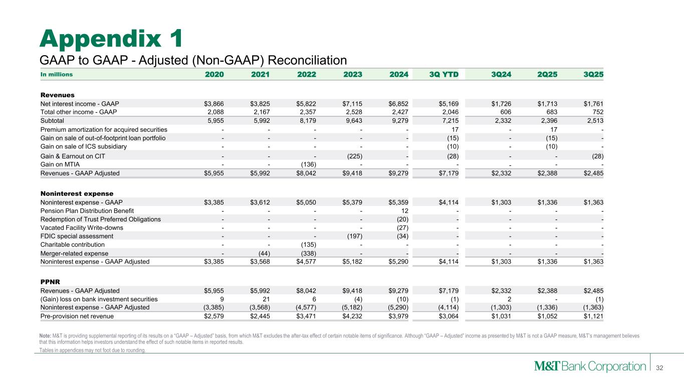 Appendix 1 Note: M&T is providing supplemental reporting of its results on a “GAAP – Adjusted” basis, from which M&T excludes the after-tax effect of certain notable items of significance. Although “GAAP – Adjusted” income as presented by M&T is not a GAAP measure, M&T’s management believes that this information helps investors understand the effect of such notable items in reported results. Tables in appendices may not foot due to rounding. GAAP to GAAP - Adjusted (Non-GAAP) Reconciliation 32 In millions 2020 2021 2022 2023 2024 3Q YTD 3Q24 2Q25 3Q25 Revenues Net interest income - GAAP $3,866 $3,825 $5,822 $7,115 $6,852 $5,169 $1,726 $1,713 $1,761 Total other income - GAAP 2,088 2,167 2,357 2,528 2,427 2,046 606 683 752 Subtotal 5,955 5,992 8,179 9,643 9,279 7,215 2,332 2,396 2,513 Premium amortization for acquired securities - - - - - 17 - 17 - Gain on sale of out-of-footprint loan portfolio - - - - - (15) - (15) - Gain on sale of ICS subsidiary - - - - - (10) - (10) - Gain & Earnout on CIT - - - (225) - (28) - - (28) Gain on MTIA - - (136) - - - - - - Revenues - GAAP Adjusted $5,955 $5,992 $8,042 $9,418 $9,279 $7,179 $2,332 $2,388 $2,485 Noninterest expense Noninterest expense - GAAP $3,385 $3,612 $5,050 $5,379 $5,359 $4,114 $1,303 $1,336 $1,363 Pension Plan Distribution Benefit - - - - 12 - - - - Redemption of Trust Preferred Obligations - - - - (20) - - - - Vacated Facility Write-downs - - - - (27) - - - - FDIC special assessment - - - (197) (34) - - - - Charitable contribution - - (135) - - - - - - Merger-related expense - (44) (338) - - - - - - Noninterest expense - GAAP Adjusted $3,385 $3,568 $4,577 $5,182 $5,290 $4,114 $1,303 $1,336 $1,363 PPNR Revenues - GAAP Adjusted $5,955 $5,992 $8,042 $9,418 $9,279 $7,179 $2,332 $2,388 $2,485 (Gain) loss on bank investment securities 9 21 6 (4) (10) (1) 2 - (1) Noninterest expense - GAAP Adjusted (3,385) (3,568) (4,577) (5,182) (5,290) (4,114) (1,303) (1,336) (1,363) Pre-provision net revenue $2,579 $2,445 $3,471 $4,232 $3,979 $3,064 $1,031 $1,052 $1,121