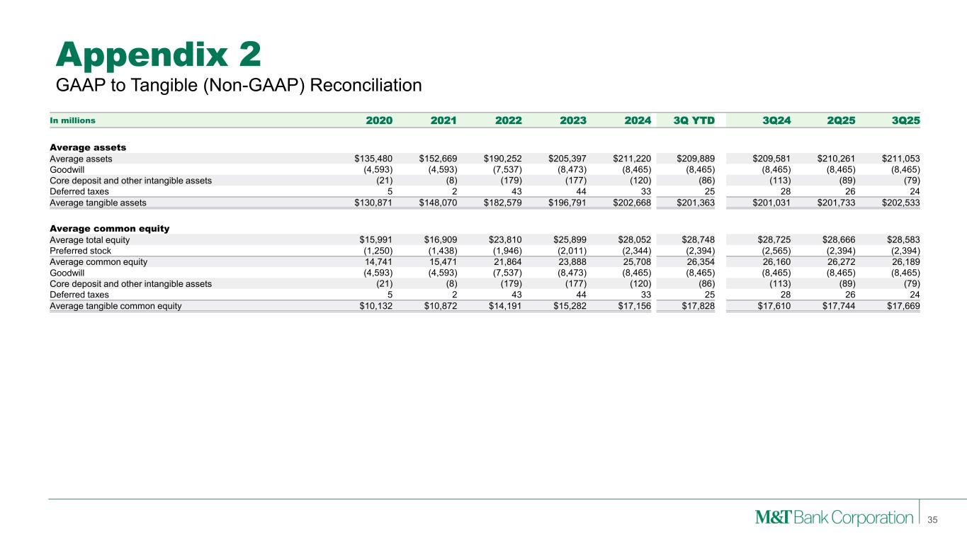 Appendix 2 Note: M&T consistently provides supplemental reporting of its results on a “net operating” or “tangible” basis, from which M&T excludes the after-tax effect of amortization of core deposit and other intangible assets (and the related goodwill, core deposit and other intangible asset balances, net of applicable deferred tax amounts) and gains (when realized) and expenses (when incurred) associated with merging acquired operations into M&T, since such items are considered by management to be “nonoperating” in nature. Although “net operating income” as defined by M&T is not a GAAP measure, M&T’s management believes that this information helps investors understand the effect of acquisition activity in reported results. (1) After any related tax effect 33 GAAP to Net Operating (Non-GAAP) Reconciliation In millions 2020 2021 2022 2023 2024 3Q YTD 3Q24 2Q25 3Q25 Net income Net income - GAAP $1,353 $1,859 $1,992 $2,741 $2,588 $2,092 $721 $716 $792 Amortization of core deposit and other intangible assets (1) 11 8 43 48 42 24 10 8 6 Merger-related expenses (1) - 34 431 - - - - - - Net operating income 1,364 1,900 2,466 2,789 2,630 2,116 731 724 798 Preferred stock dividends (68) (73) (97) (100) (134) (107) (47) (35) (36) Net operating income available to common equity $1,296 $1,827 $2,369 $2,689 $2,496 $2,009 $684 $689 $762