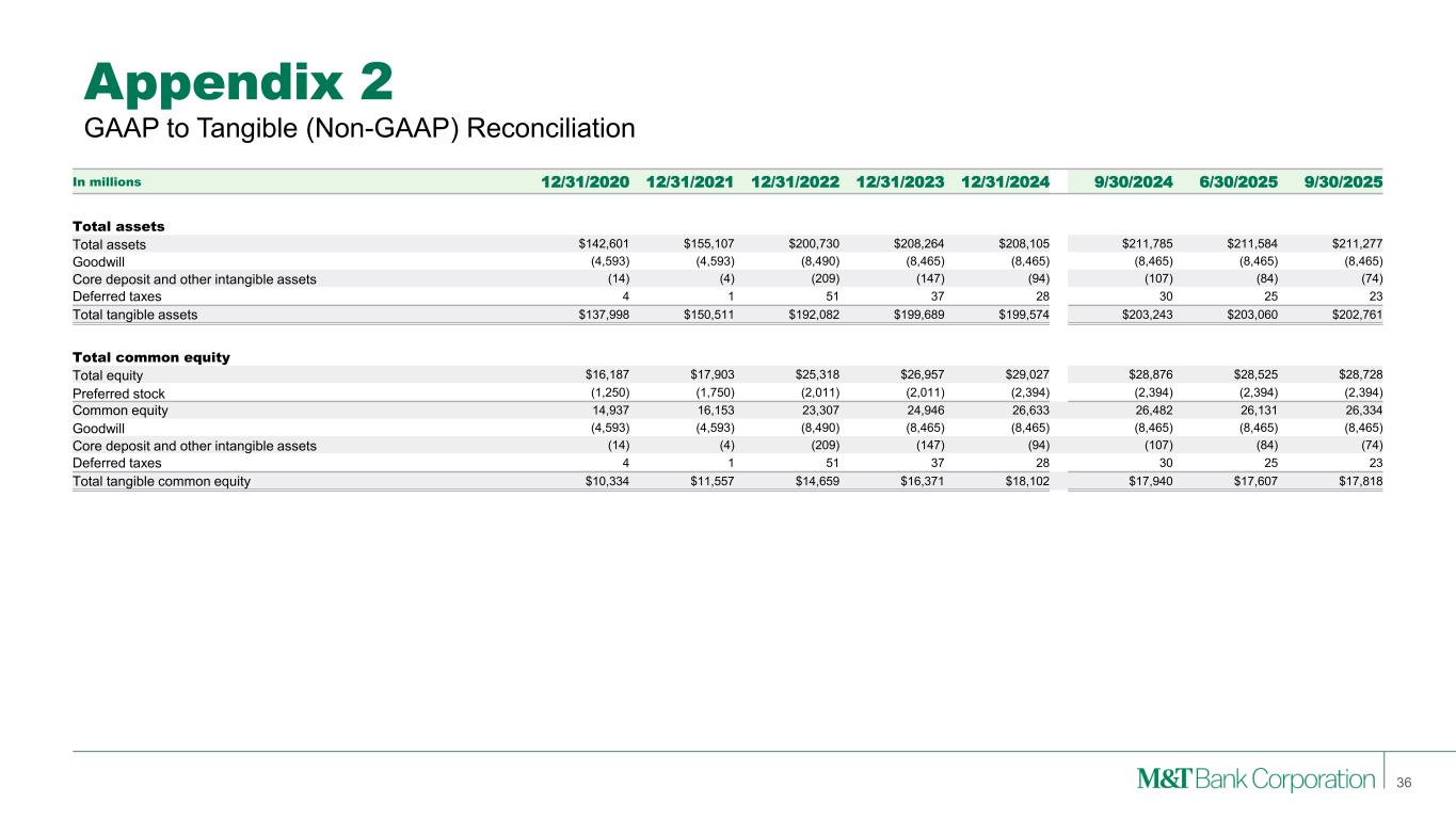 Appendix 2 GAAP to Tangible (Non-GAAP) Reconciliation 36 In millions 12/31/2020 12/31/2021 12/31/2022 12/31/2023 12/31/2024 9/30/2024 6/30/2025 9/30/2025 Total assets Total assets $142,601 $155,107 $200,730 $208,264 $208,105 $211,785 $211,584 $211,277 Goodwill (4,593) (4,593) (8,490) (8,465) (8,465) (8,465) (8,465) (8,465) Core deposit and other intangible assets (14) (4) (209) (147) (94) (107) (84) (74) Deferred taxes 4 1 51 37 28 30 25 23 Total tangible assets $137,998 $150,511 $192,082 $199,689 $199,574 $203,243 $203,060 $202,761 Total common equity Total equity $16,187 $17,903 $25,318 $26,957 $29,027 $28,876 $28,525 $28,728 Preferred stock (1,250) (1,750) (2,011) (2,011) (2,394) (2,394) (2,394) (2,394) Common equity 14,937 16,153 23,307 24,946 26,633 26,482 26,131 26,334 Goodwill (4,593) (4,593) (8,490) (8,465) (8,465) (8,465) (8,465) (8,465) Core deposit and other intangible assets (14) (4) (209) (147) (94) (107) (84) (74) Deferred taxes 4 1 51 37 28 30 25 23 Total tangible common equity $10,334 $11,557 $14,659 $16,371 $18,102 $17,940 $17,607 $17,818