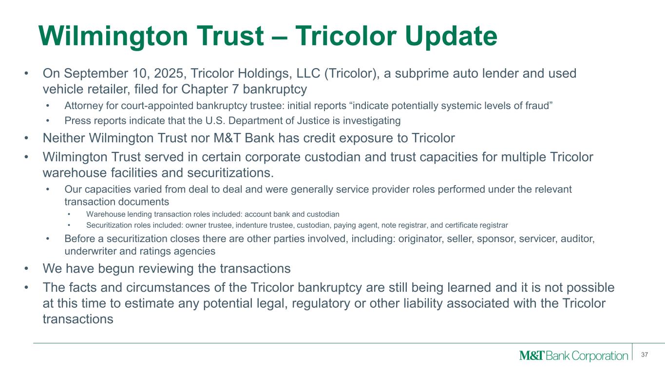 Wilmington Trust – Tricolor Update 37 Build our New England ad Long Island Markets Make our Systems and Processes Resilient and Scalable Continue to Develop and Scale our Capability to Manage Risk • On September 10, 2025, Tricolor Holdings, LLC (Tricolor), a subprime auto lender and used vehicle retailer, filed for Chapter 7 bankruptcy • Attorney for court-appointed bankruptcy trustee: initial reports “indicate potentially systemic levels of fraud” • Press reports indicate that the U.S. Department of Justice is investigating • Neither Wilmington Trust nor M&T Bank has credit exposure to Tricolor • Wilmington Trust served in certain corporate custodian and trust capacities for multiple Tricolor warehouse facilities and securitizations. • Our capacities varied from deal to deal and were generally service provider roles performed under the relevant transaction documents • Warehouse lending transaction roles included: account bank and custodian • Securitization roles included: owner trustee, indenture trustee, custodian, paying agent, note registrar, and certificate registrar • Before a securitization closes there are other parties involved, including: originator, seller, sponsor, servicer, auditor, underwriter and ratings agencies • We have begun reviewing the transactions • The facts and circumstances of the Tricolor bankruptcy are still being learned and it is not possible at this time to estimate any potential legal, regulatory or other liability associated with the Tricolor transactions