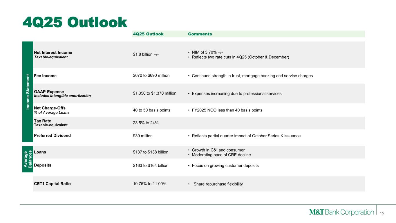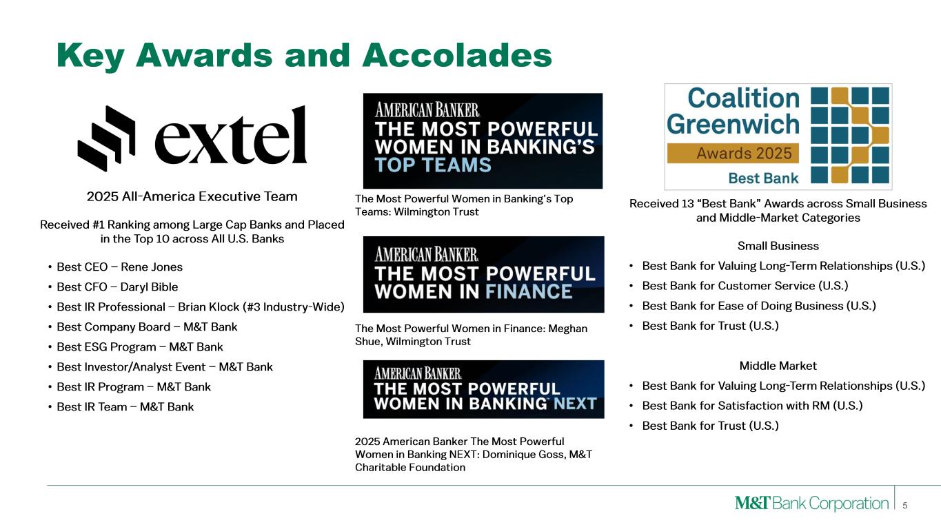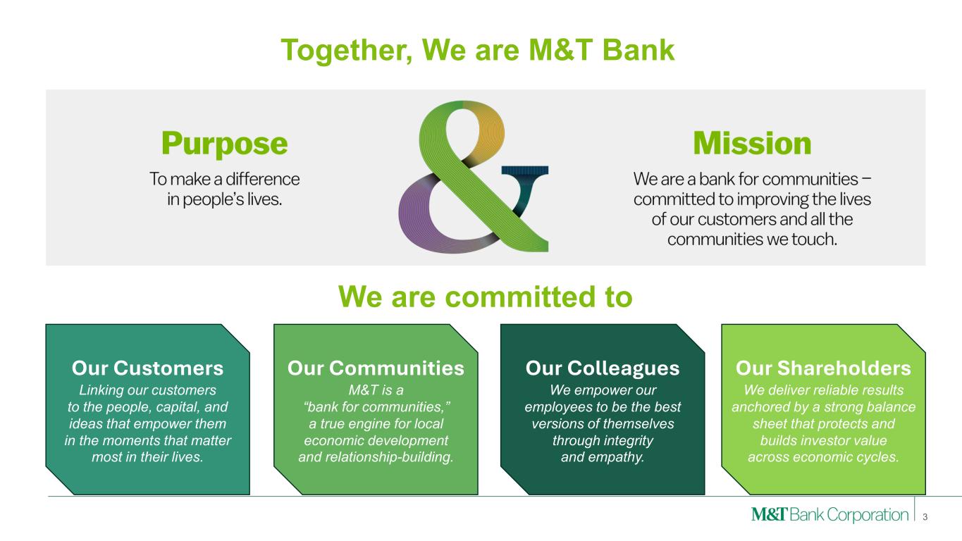 Forward-Looking Statements and Non-GAAP Financial Measures This presentation may contain forward-looking statements regarding M&T Bank Corporation (“M&T”) within the meaning of the Private Securities Litigation Reform Act of 1995 and the rules and regulations of the Securities and Exchange Commission (“SEC”). Any statement that does not describe historical or current facts is a forward-looking statement, including statements based on current expectations, estimates and projections about M&T's business, and management's beliefs and assumptions. Statements regarding the potential effects of events or factors specific to M&T and/or the financial industry as a whole, as well as national and global events generally, on M&T's business, financial condition, liquidity and results of operations may constitute forward-looking statements. Such statements are subject to the risk that the actual effects may differ, possibly materially, from what is reflected in those forward-looking statements due to factors and future developments that are uncertain, unpredictable and in many cases beyond M&T's control. Forward-looking statements are typically identified by words such as "believe," "expect," "anticipate," "intend," "target," "estimate," "continue," or "potential," by future conditional verbs such as "will," "would," "should," "could," or "may," or by variations of such words or by similar expressions. These statements are not guarantees of future performance and involve certain risks, uncertainties and assumptions which are difficult to predict and may cause actual outcomes to differ materially from what is expressed or forecasted. While there can be no assurance that any list of risks and uncertainties is complete, important factors that could cause actual outcomes and results to differ materially from those contemplated by forward-looking statements include the following, without limitation: economic conditions and growth rates, including inflation and market volatility; events, developments and current conditions in the financial services industry, including trust, brokerage and investment management businesses; changes in interest rates, spreads on earning assets and interest-bearing liabilities, and interest rate sensitivity; prepayment speeds, loan originations, loan concentrations by type and industry, credit losses and market values on loans, collateral securing loans, and other assets; sources of liquidity; levels of client deposits; ability to contain costs and expenses; changes in M&T's credit ratings; domestic or international political developments and other geopolitical events, including trade and tariff policies and international conflicts and hostilities; changes and trends in the securities markets; common shares outstanding and common stock price volatility; fair value of and number of stock-based compensation awards to be issued in future periods; the impact of changes in market values on trust-, brokerage-, and investment management-related revenues; federal, state or local legislation and/or regulations affecting the financial services industry, or M&T and its subsidiaries individually or collectively, including tax policy; regulatory supervision and oversight, including monetary policy and capital requirements; governmental and public policy changes; political conditions, either nationally or in the states in which M&T and its subsidiaries do business; the initiation and outcome of potential, pending and future litigation, investigations and governmental proceedings, including tax-related examinations and other matters; operational risk events, including loss resulting from fraud by employees or persons outside M&T and breaches in data and cybersecurity; changes in accounting policies or procedures as may be required by the Financial Accounting Standards Board, regulatory agencies or legislation; increasing price, product and service competition by competitors, including new entrants; technological developments and changes; the ability to continue to introduce competitive new products and services on a timely, cost-effective basis; the mix of products and services; protection and validity of intellectual property rights; reliance on large customers; technological, implementation and cost/financial risks in large, multi-year contracts; continued availability of financing; financial resources in the amounts, at the times and on the terms required to support M&T and its subsidiaries' future businesses; and material differences in the actual financial results of merger, acquisition, divestment and investment activities compared with M&T's initial expectations, including the full realization of anticipated cost savings and revenue enhancements. These are representative of the factors that could affect the outcome of the forward-looking statements. In addition, as noted, such statements could be affected by general industry and market conditions and growth rates, general economic and political conditions, either nationally or in the states in which M&T and its subsidiaries do business, and other factors. M&T provides further detail regarding these risks and uncertainties in its Form 10-K for the year ended December 31, 2024, including in the Risk Factors section of such report, as well as in other SEC filings. Forward-looking statements speak only as of the date they are made, and M&T assumes no duty and does not undertake to update forward-looking statements. Annualized, pro forma, projected, and estimated numbers are used for illustrative purposes only, are not forecasts and may not reflect actual results. This presentation also contains financial information and performance measures determined by methods other than in accordance with accounting principles generally accepted in the United States ("GAAP"). Management believes investors may find these non-GAAP financial measures useful. These disclosures should not be viewed as a substitute for financial measures determined i