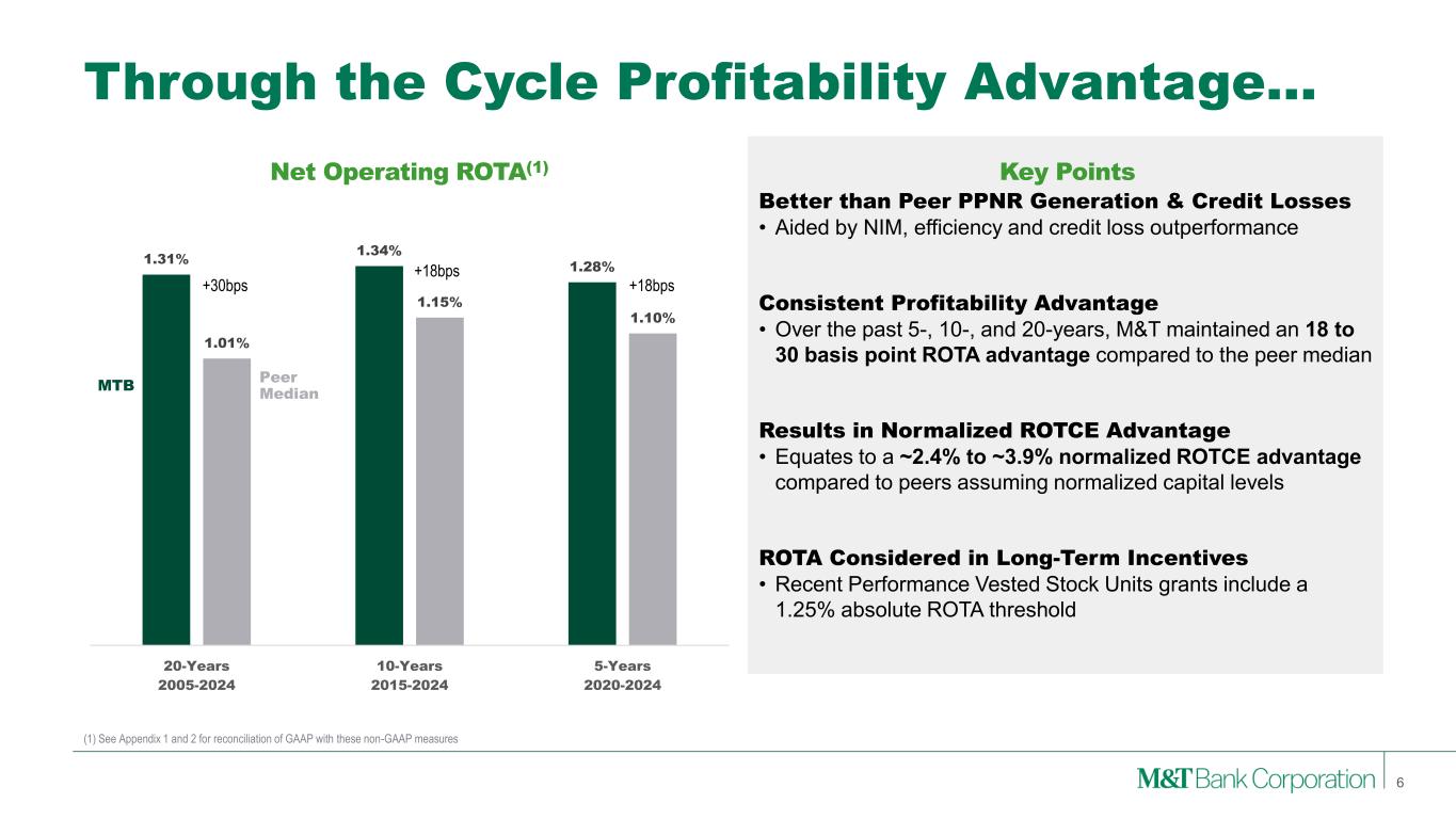Through the Cycle Profitability Advantage… 6 (1) See Appendix 1 and 2 for reconciliation of GAAP with these non-GAAP measures Net Operating ROTA(1) Better than Peer PPNR Generation & Credit Losses • Aided by NIM, efficiency and credit loss outperformance Consistent Profitability Advantage • Over the past 5-, 10-, and 20-years, M&T maintained an 18 to 30 basis point ROTA advantage compared to the peer median Results in Normalized ROTCE Advantage • Equates to a ~2.4% to ~3.9% normalized ROTCE advantage compared to peers assuming normalized capital levels ROTA Considered in Long-Term Incentives • Recent Performance Vested Stock Units grants include a 1.25% absolute ROTA threshold +30bps +18bps +18bps Key Points MTB Peer Median 1.31% 1.34% 1.28% 1.01% 1.15% 1.10% 20-Years 2005-2024 10-Years 2015-2024 5-Years 2020-2024