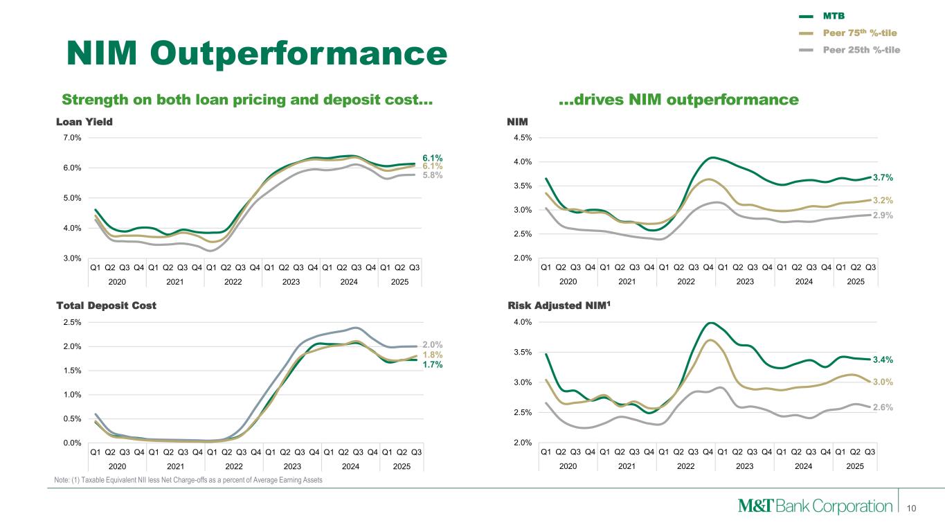 Solid Performance in Key Metrics against Peers 9 ROTA(1) 3Q25 Net Interest Margin 3Q25 Efficiency Ratio(1) 3Q25 PPNR / RWA(1) 3Q25 NCO / Loans 3Q25 Source: S&P Global Market Intelligence and company filings (1) See Appendix 1 and 2 for reconciliation of GAAP with these non-GAAP measures 1.56% MTB Peer 1 Peer 2 Peer 3 Peer 4 Peer 5 Peer 6 Peer 7 Peer 8 Peer 9 Peer 10 Peer 11 3.68% MTB Peer 1 Peer 2 Peer 3 Peer 4 Peer 5 Peer 6 Peer 7 Peer 8 Peer 9 Peer 10 Peer 11 53.6% MTB Peer 1 Peer 2 Peer 3 Peer 4 Peer 5 Peer 6 Peer 7 Peer 8 Peer 9 Peer 10 Peer 11 2.8% MTB Peer 1 Peer 2 Peer 3 Peer 4 Peer 5 Peer 6 Peer 7 Peer 8 Peer 9 Peer 10 Peer 11 0.42% Peer 1 Peer 2 Peer 3 Peer 4 Peer 5 MTB Peer 6 Peer 7 Peer 8 Peer 9 Peer 10 Peer 11