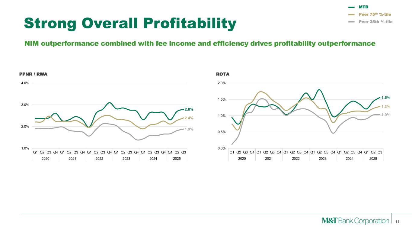 NIM Outperformance 10 Note: (1) Taxable Equivalent NII less Net Charge-offs as a percent of Average Earning Assets Strength on both loan pricing and deposit cost… …drives NIM outperformance Loan Yield NIM Total Deposit Cost Risk Adjusted NIM1 3.7% 3.2% 2.9% 2.0% 2.5% 3.0% 3.5% 4.0% 4.5% Q1 Q2 Q3 Q4 Q1 Q2 Q3 Q4 Q1 Q2 Q3 Q4 Q1 Q2 Q3 Q4 Q1 Q2 Q3 Q4 Q1 Q2 Q3 2020 2021 2022 2023 2024 2025 6.1% 6.1% 5.8% 3.0% 4.0% 5.0% 6.0% 7.0% Q1 Q2 Q3 Q4 Q1 Q2 Q3 Q4 Q1 Q2 Q3 Q4 Q1 Q2 Q3 Q4 Q1 Q2 Q3 Q4 Q1 Q2 Q3 2020 2021 2022 2023 2024 2025 1.7% 2.0% 1.8% 0.0% 0.5% 1.0% 1.5% 2.0% 2.5% Q1 Q2 Q3 Q4 Q1 Q2 Q3 Q4 Q1 Q2 Q3 Q4 Q1 Q2 Q3 Q4 Q1 Q2 Q3 Q4 Q1 Q2 Q3 2020 2021 2022 2023 2024 2025 3.4% 2.6% 3.0% 2.0% 2.5% 3.0% 3.5% 4.0% Q1 Q2 Q3 Q4 Q1 Q2 Q3 Q4 Q1 Q2 Q3 Q4 Q1 Q2 Q3 Q4 Q1 Q2 Q3 Q4 Q1 Q2 Q3 2020 2021 2022 2023 2024 2025 MTB Peer 75th %-tile Peer 25th %-tile