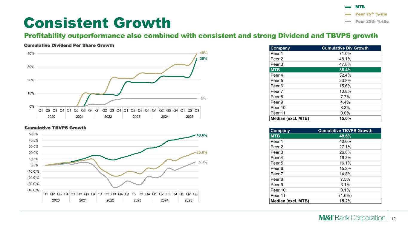 Strong Overall Profitability 11 NIM outperformance combined with fee income and efficiency drives profitability outperformance PPNR / RWA ROTA 2.8% 2.4% 1.9% 1.0% 2.0% 3.0% 4.0% Q1 Q2 Q3 Q4 Q1 Q2 Q3 Q4 Q1 Q2 Q3 Q4 Q1 Q2 Q3 Q4 Q1 Q2 Q3 Q4 Q1 Q2 Q3 2020 2021 2022 2023 2024 2025 1.6% 1.3% 1.0% 0.0% 0.5% 1.0% 1.5% 2.0% Q1 Q2 Q3 Q4 Q1 Q2 Q3 Q4 Q1 Q2 Q3 Q4 Q1 Q2 Q3 Q4 Q1 Q2 Q3 Q4 Q1 Q2 Q3 2020 2021 2022 2023 2024 2025 MTB Peer 75th %-tile Peer 25th %-tile