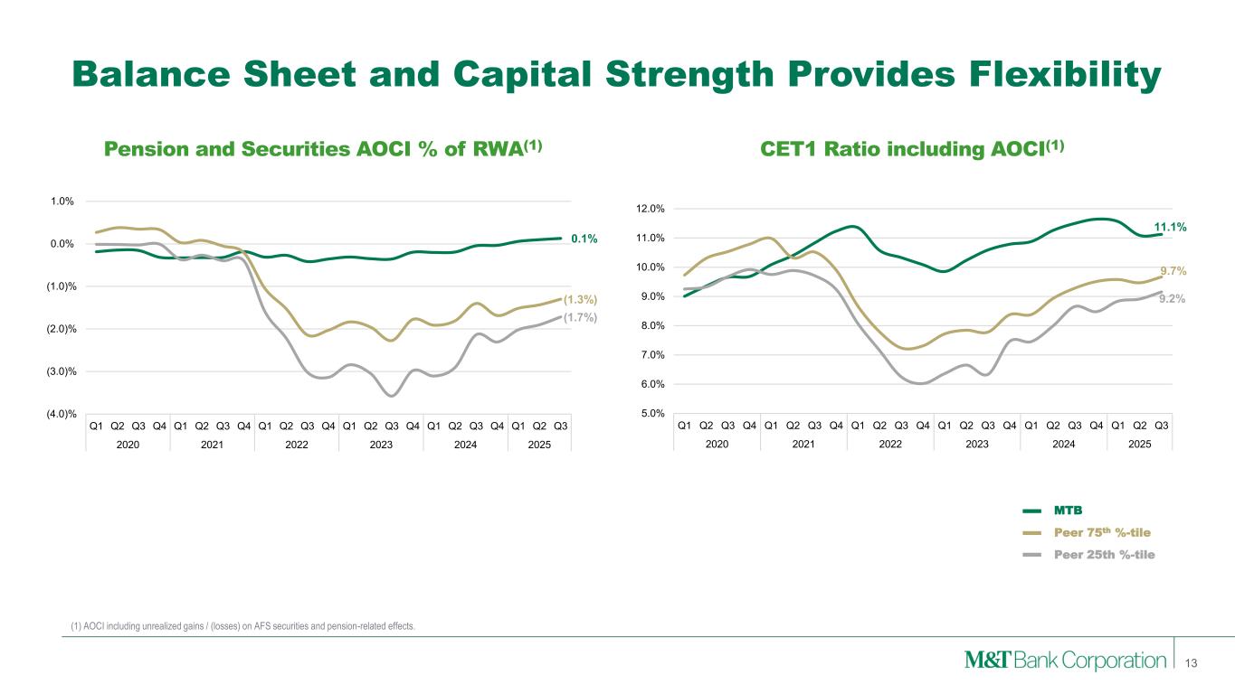 Consistent Growth 12 Profitability outperformance also combined with consistent and strong Dividend and TBVPS growth Cumulative Dividend Per Share Growth Cumulative TBVPS Growth 36% 40% 6% 0% 10% 20% 30% 40% Q1 Q2 Q3 Q4 Q1 Q2 Q3 Q4 Q1 Q2 Q3 Q4 Q1 Q2 Q3 Q4 Q1 Q2 Q3 Q4 Q1 Q2 Q3 2020 2021 2022 2023 2024 2025 48.6% 5.3% 20.8% (40.0)% (30.0)% (20.0)% (10.0)% 0.0% 10.0% 20.0% 30.0% 40.0% 50.0% Q1 Q2 Q3 Q4 Q1 Q2 Q3 Q4 Q1 Q2 Q3 Q4 Q1 Q2 Q3 Q4 Q1 Q2 Q3 Q4 Q1 Q2 Q3 2020 2021 2022 2023 2024 2025 Company Cumulative TBVPS Growth MTB 48.6% Peer 1 40.0% Peer 2 27.1% Peer 3 26.8% Peer 4 16.3% Peer 5 16.1% Peer 6 15.2% Peer 7 14.8% Peer 8 7.5% Peer 9 3.1% Peer 10 3.1% Peer 11 (1.6%) Median (excl. MTB) 15.2% Company Cumulative Div Growth Peer 1 71.0% Peer 2 48.1% Peer 3 47.8% MTB 36.4% Peer 4 32.4% Peer 5 23.8% Peer 6 15.6% Peer 7 10.8% Peer 8 7.7% Peer 9 4.4% Peer 10 3.3% Peer 11 0.0% Median (excl. MTB) 15.6% MTB Peer 75th %-tile Peer 25th %-tile