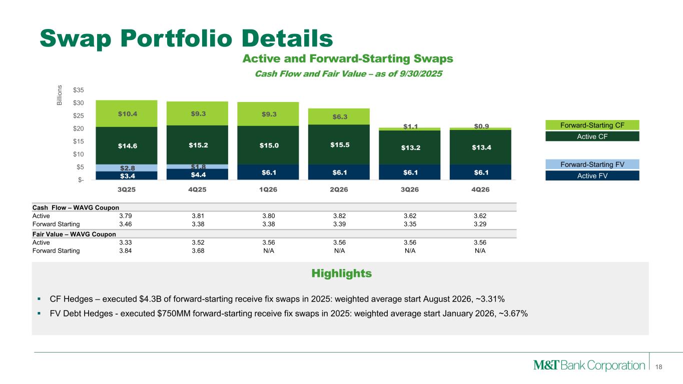 Diversified Business Model Experienced teams provide a wide-range of credit, liquidity and capital markets solutions to meet our customer needs, delivered through a local engagement model and industry expertise on a national scale. Strategically built for the communities in which we operate. High-touch, local sales and service model provides a low-cost, stable funding base, a long-tenured customer base, and the shared benefits of community growth and development. 17 Institutional Services Expanding on strength of its reputation for industry leading service and strong reputation with existing network of deal influencers. Wealth Management Provides planning-led advice, leveraging Wilmington Trust’s national capabilities and the enhanced experience that LPL brings, to grow customers across the wealth continuum. Note: ‘All Other’ category not shown above. Represents 3% ($144 million) of NII, 4% ($90 million) of fees, 3% ($234 million) of revenue, <0.25% (<$0.25 billion) of loans and 5% ($8 billion) of deposits. (1) Net interest income is the difference between actual taxable-equivalent interest earned on assets and interest paid on liabilities by a segment and a funding charge (credit) based on the Company’s internal funds transfer pricing methodology (2) See Appendix 1 and 2 for reconciliation of GAAP with these non-GAAP measures Commercial Bank Retail Bank Institutional Services & Wealth Management Net Interest Income1 $1,599 million 31% $2,959 million 57% $500 million 10% $5,202 million Fee Income $587 million 29% $691 million 34% $678 million 33% $2,046 million Revenue $2,186 million 30% $3,650 million 50% $1,178 million 16% $7,248 million Average Loans $78 billion 57% $53 billion 39% $4 billion 3% $136 billion Average Deposits $46 billion 28% $90 billion 55% $19 billion 12% $162 billion ROTA2 1.17% 2.61% 12.30% 1.41% ROTCE2 13.2% 31.0% 81.4% 15.1% Efficiency Ratio2 49.4% 53.7% 55.1% 56.3% 3Q25 YTD, % of Total M&T Total M&T