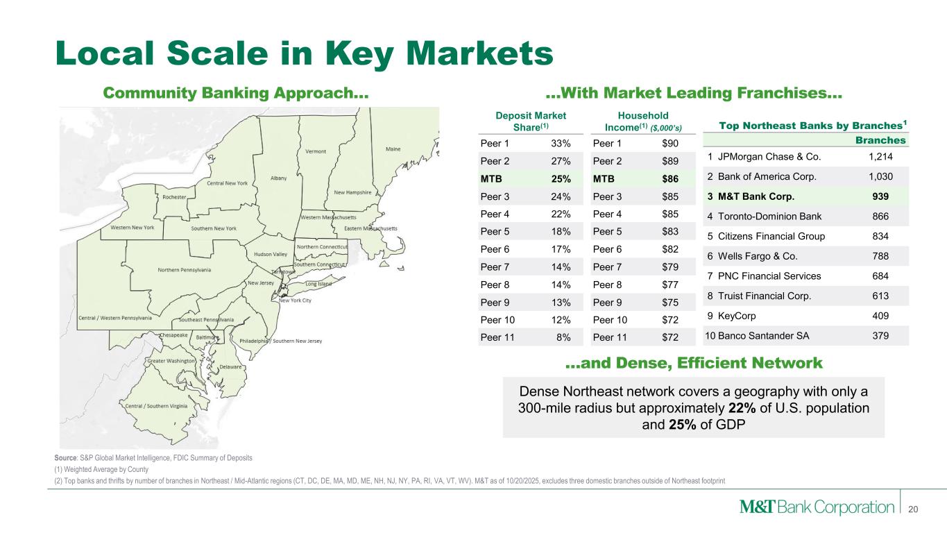 31% 20%14% 5% 8% 7% 15% Fee Income Momentum 19 • Consistent growth in noninterest income(1) over past year; YTD25 results are up 15% from the prior YTD with growth in all fee income lines • Total noninterest income(1) is 28% of total revenue(2), which is lower than peer median for YTD25 as a result of top NIM; 32% of total revenue assuming M&T had peer median NIM Noninterest Income Mix(1) 3Q25 YTD Noninterest Income(1) Trust and Brokerage Mortgage Residential Mortgage Commercial Service Charges LOC & Credit- Related Credit Card & Merchant Other 3Q25 YTD Noninterest Income(1) $2.0B Diversified Fee Businesses Perform Across Cycles (1) Noninterest income excluding securities gains and losses. 2Q25 noninterest income includes two one-time gains ($15 million gain on sale of out-of-footprint CRE loan portfolio & $10 million gain on the sale of a subsidiary that specialized in institutional services). 3Q25 noninterest income includes an earnout payment of $28 million related to the 2023 sale of the Collective Investment Trust (CIT) business (2) Total revenue includes taxable-equivalent NII and noninterest income excluding securities gains and losses $608 $639 $611 $658 $723$25 $28 3Q24 4Q24 1Q25 2Q25 3Q25 Noninterest Income Notable Items $683 $751