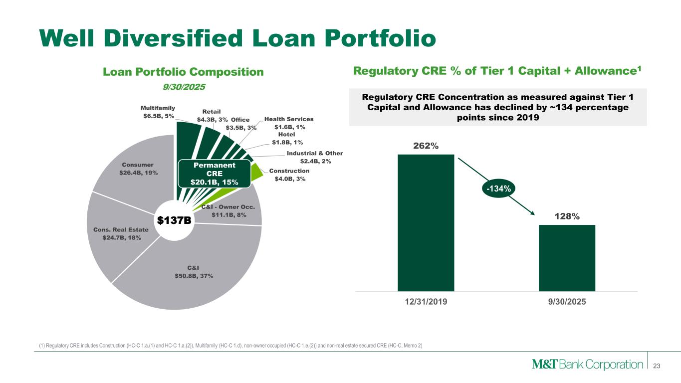 Multifamily $6.5B, 5% Retail $4.3B, 3% Office $3.5B, 3% Health Services $1.6B, 1% Hotel $1.8B, 1% Industrial & Other $2.4B, 2% Construction $4.0B, 3% C&I - Owner Occ. $11.1B, 8% C&I $50.8B, 37% Cons. Real Estate $24.7B, 18% Consumer $26.4B, 19% Permanent CRE $20.1B, 15% Well Diversified Loan Portfolio (1) Regulatory CRE includes Construction (HC-C 1.a.(1) and HC-C 1.a.(2)), Multifamily (HC-C 1.d), non-owner occupied (HC-C 1.e.(2)) and non-real estate secured CRE (HC-C, Memo 2) Loan Portfolio Composition 9/30/2025 Regulatory CRE % of Tier 1 Capital + Allowance1 Regulatory CRE Concentration as measured against Tier 1 Capital and Allowance has declined by ~134 percentage points since 2019 $137B 23 262% 128% 12/31/2019 9/30/2025 -134%