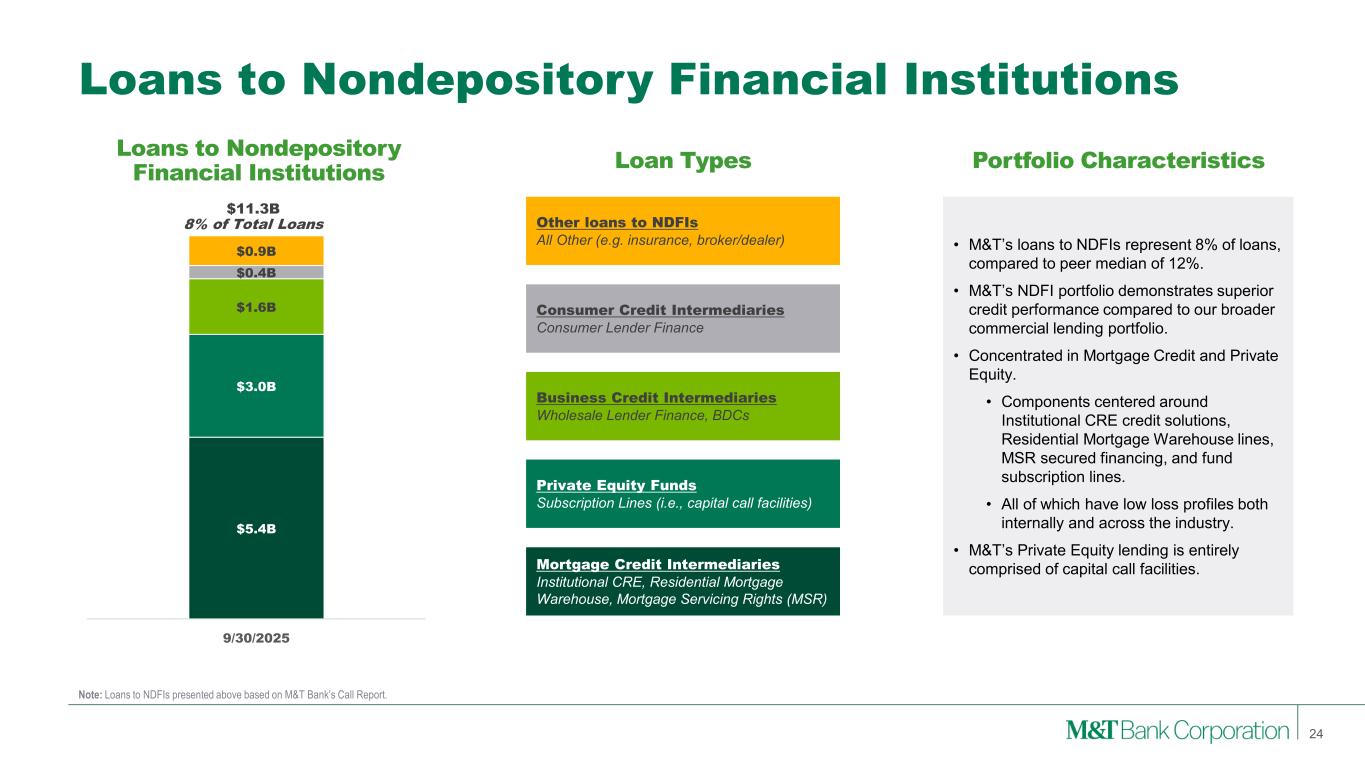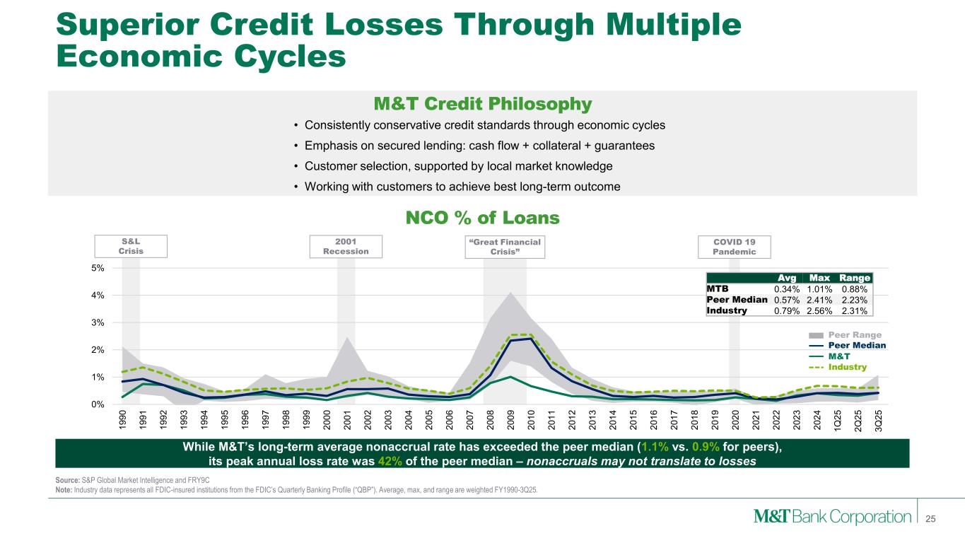 Loans to Nondepository Financial Institutions 24 Note: Loans to NDFIs presented above based on M&T Bank’s Call Report. Loans to Nondepository Financial Institutions Loan Types • M&T’s loans to NDFIs represent 8% of loans, compared to peer median of 12%. • M&T’s NDFI portfolio demonstrates superior credit performance compared to our broader commercial lending portfolio. • Concentrated in Mortgage Credit and Private Equity. • Components centered around Institutional CRE credit solutions, Residential Mortgage Warehouse lines, MSR secured financing, and fund subscription lines. • All of which have low loss profiles both internally and across the industry. • M&T’s Private Equity lending is entirely comprised of capital call facilities.Mortgage Credit Intermediaries Institutional CRE, Residential Mortgage Warehouse, Mortgage Servicing Rights (MSR) Private Equity Funds Subscription Lines (i.e., capital call facilities) Business Credit Intermediaries Wholesale Lender Finance, BDCs Consumer Credit Intermediaries Consumer Lender Finance Other loans to NDFIs All Other (e.g. insurance, broker/dealer) $11.3B 8% of Total Loans Portfolio Characteristics $5.4B $3.0B $1.6B $0.4B $0.9B 9/30/2025