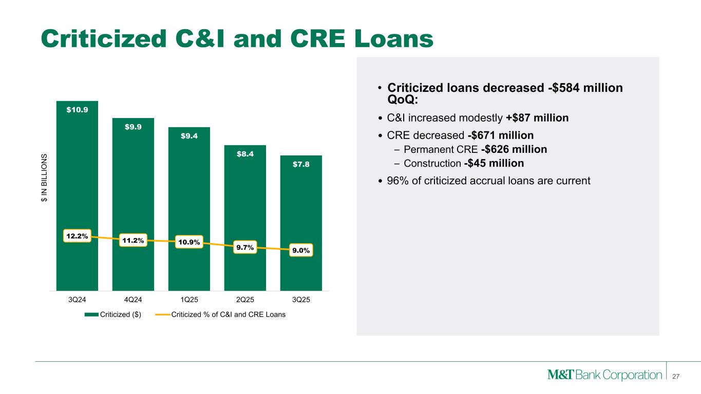 Credit Metrics Nonaccrual Loans Net Charge-offs Provision for Credit Losses Allowance for Loan Losses 26 $120 $160 $114 $108 $146 0.35% 0.47% 0.34% 0.32% 0.42% 3Q24 4Q24 1Q25 2Q25 3Q25 $ I N M IL L IO N S Net Charge-offs ($) Net Charge-off Ratio (%) $1,926 $1,690 $1,540 $1,573 $1,512 1.42% 1.25% 1.14% 1.16% 1.10% 3Q24 4Q24 1Q25 2Q25 3Q25 $ I N M IL L IO N S Nonaccrual Loans ($) Nonaccrual Loans (%) $120 $140 $130 $105 $110 $20 $15 3Q24 4Q24 1Q25 2Q25 3Q25 $ I N M IL L IO N S Provision for Loan Losses Provision for Unfunded Credit Commitments $2,204 $2,184 $2,200 $2,197 $2,161 1.62% 1.61% 1.63% 1.61% 1.58% 3Q24 4Q24 1Q25 2Q25 3Q25 $ I N M IL L IO N S Allowance for Loan Losses ($) Allowance for Loan Losses (%)